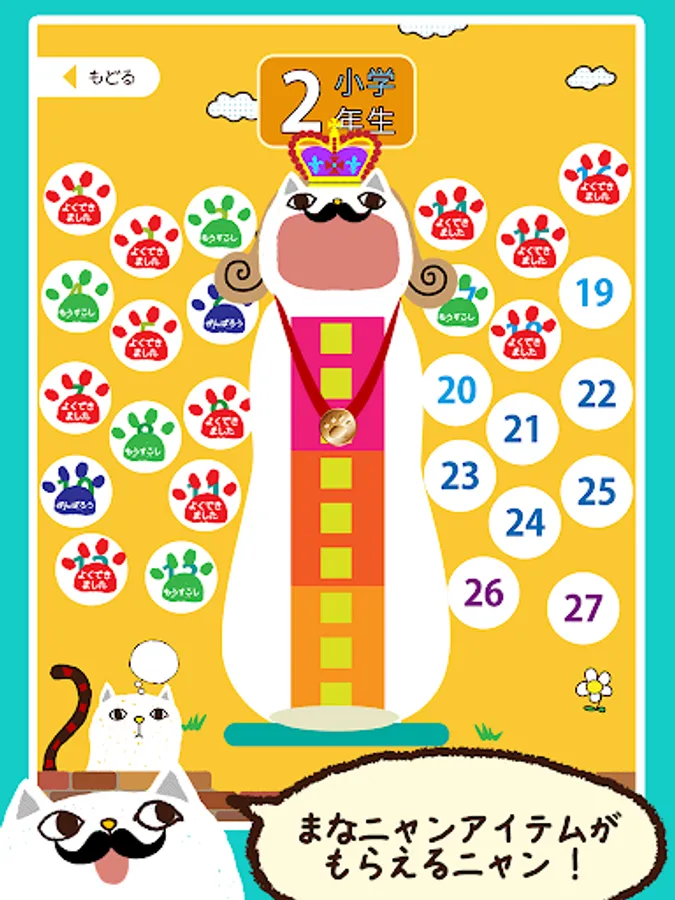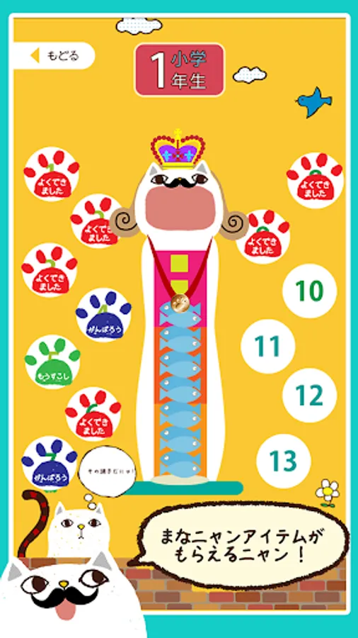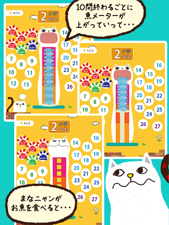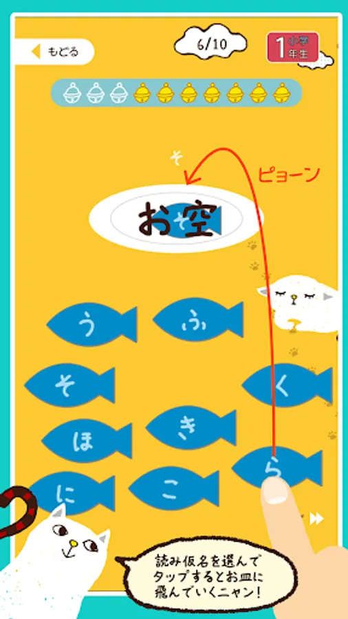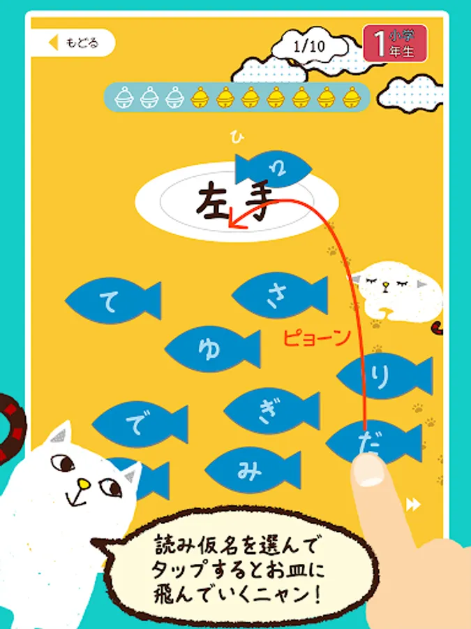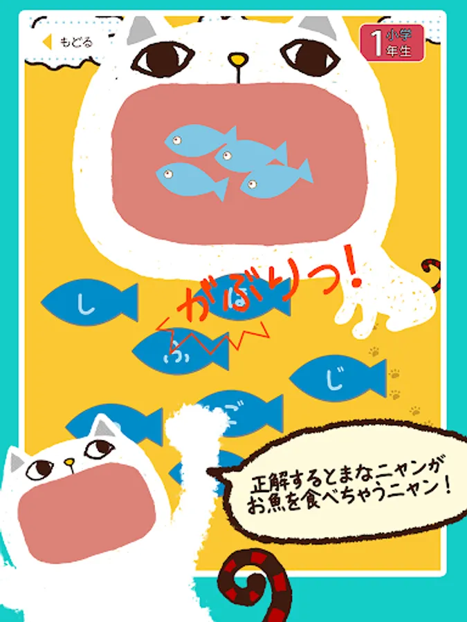 The menu is divided by grade, and 10 questions are made for each time. Choose the reading of the kanji that is issued one by one from the characters written on the fish. In the case of correct answer, it is satisfactory to be able to eat fish, and if it is incorrect it is a bit grumpy. Let's answer within 10 seconds of time per question. Time bells will tell you.