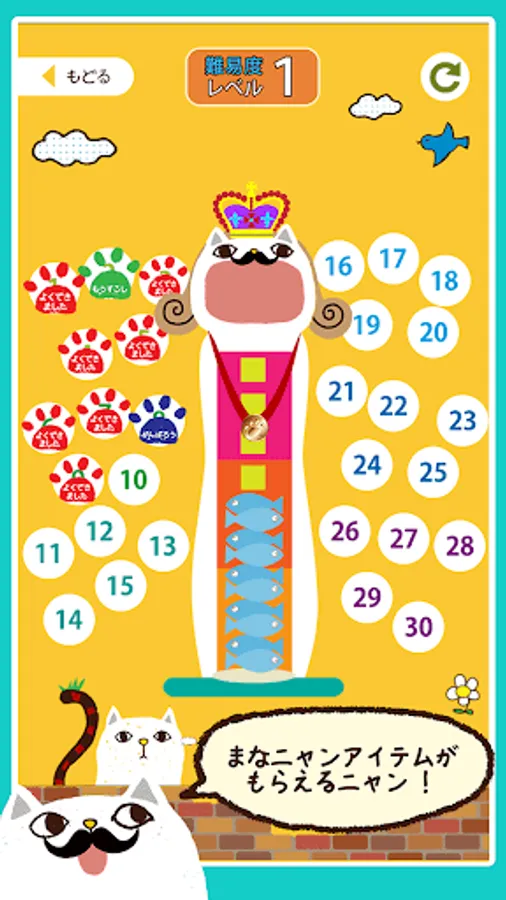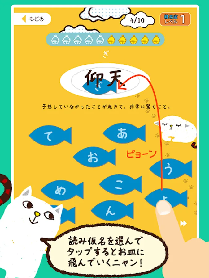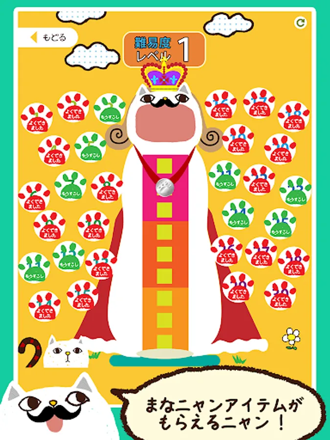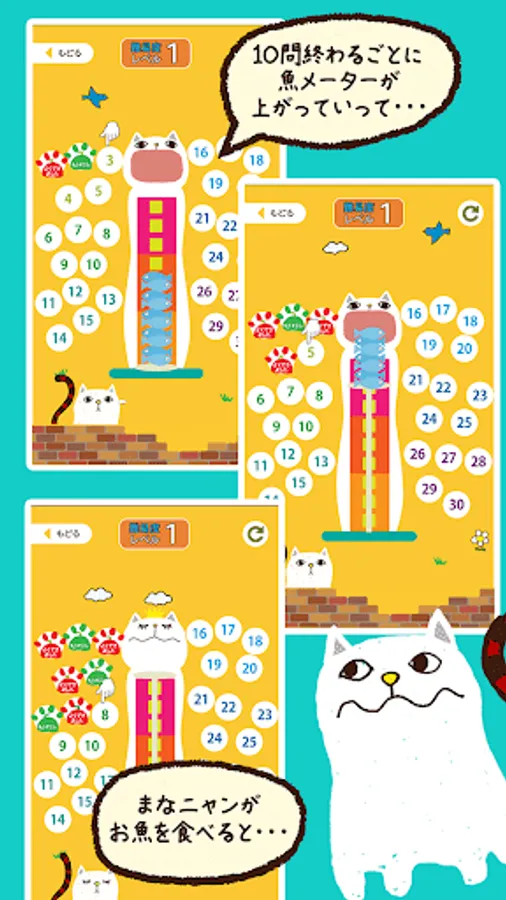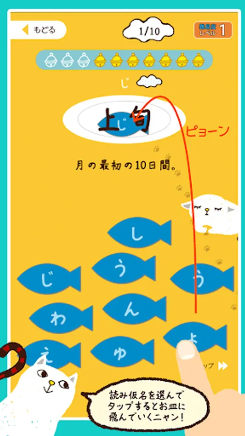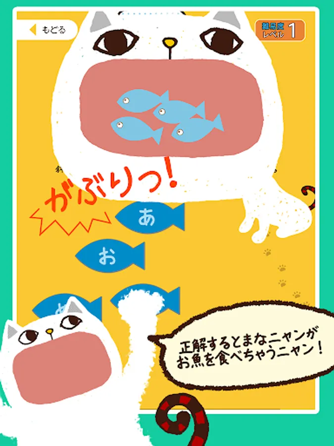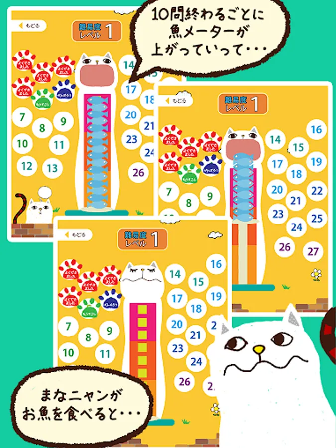 Menu is divided into each grade, questions the 10 questions at a time. Reading of Chinese characters that are issued by one question is Nao, and select from the character written to fish. Satisfaction if the correct answer Hama a Nyan is to be able to eat the fish, a little cranky in the case of an incorrect answer. One question per Let's answer within the allotted time of 10 seconds. Time is informed me tin lined.