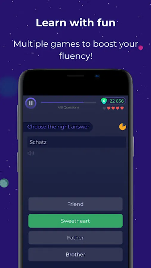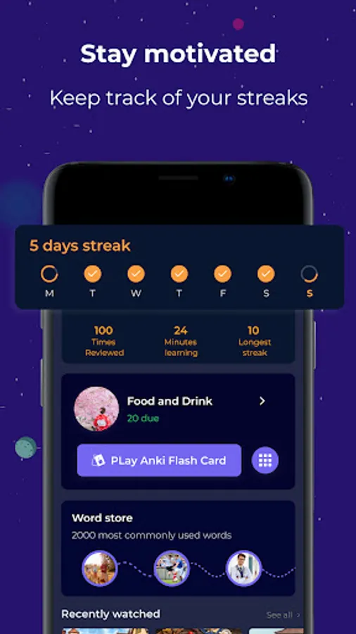 Our Anki-inspired review method uses Spaced Repetition to recognize what you are learning well and nudge you to review only the words you’re weak at. With the help of quick, fun games, you will get to increase your fluency little by little.