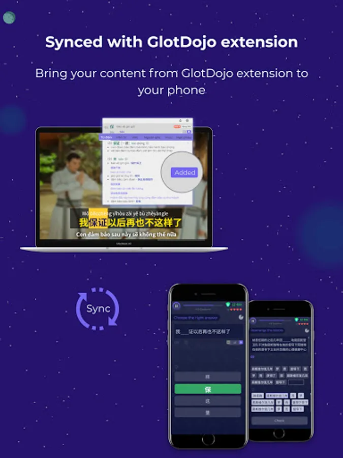 With your portable GlotDojo app, you can now easily download all words you saved on your laptop with GlotDojo Chrome extension and continue learning them on your smaller screen. From laptop to phone and back, learning now feels seamless.