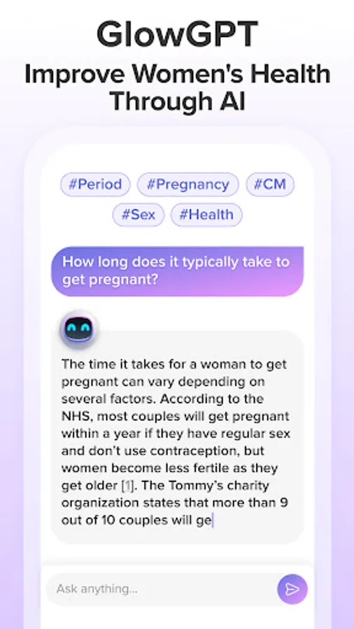 ✔️ AI-Powered Predictions: Glow utilizes advanced AI to provide personalized fertility advice and predictions. The more data you enter, the smarter it gets, making your journey to conceive more manageable and less stressful.