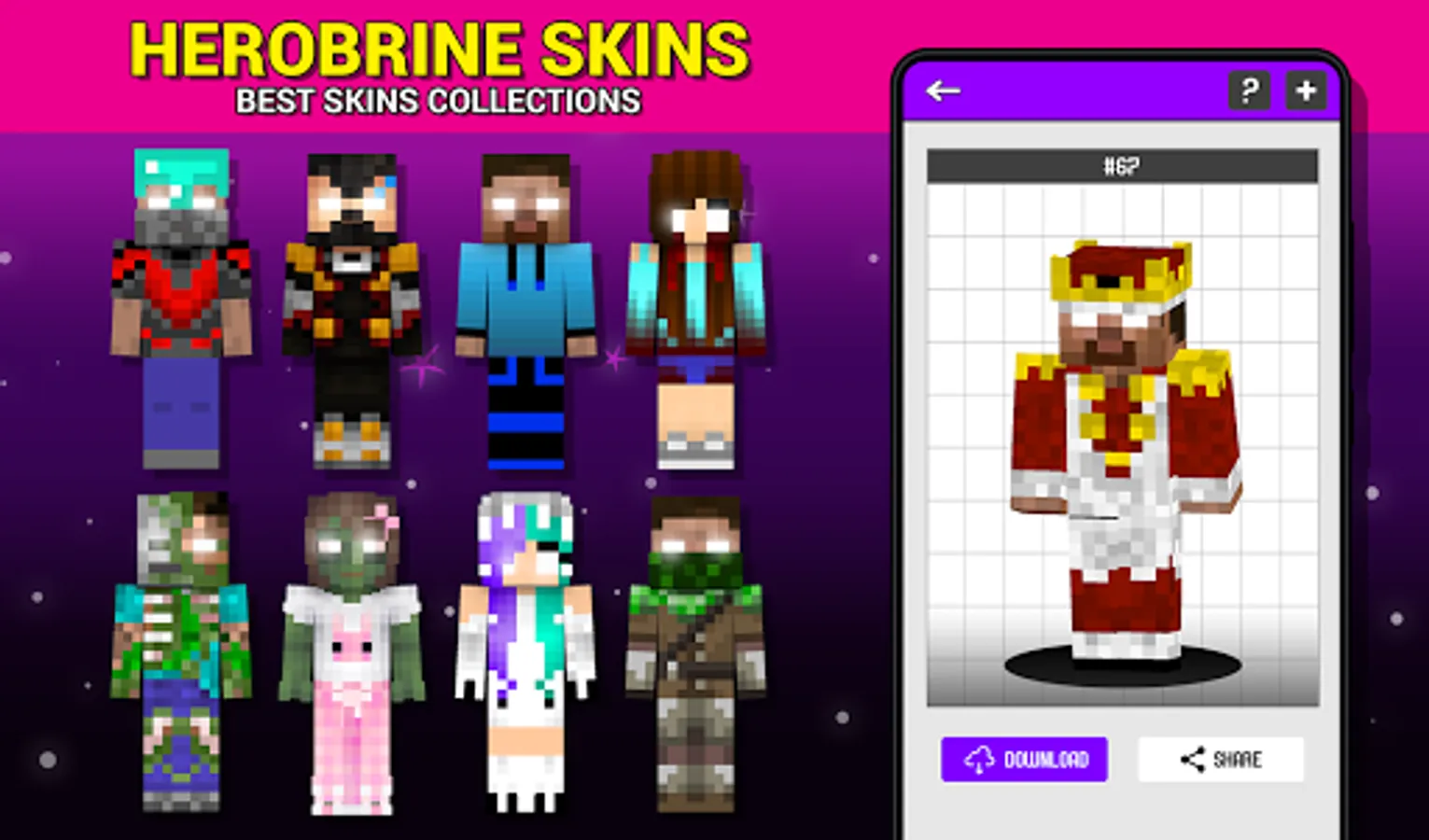 Looking for NEW Herobrine Skins For Minecraft pocket edition with 3d preview? Get new best collections with Popular and rare Herobrine skins MCPE to show other players how coolest you are! Just click download button and change Herobrine skins to your minecraft game. Very simple and easy! You will be extremely excited by the high quality of Herobrine skins for both gender boys and girls. The application will 100% satisfy all your needs in beautyful skins for Minecraft MCPE.