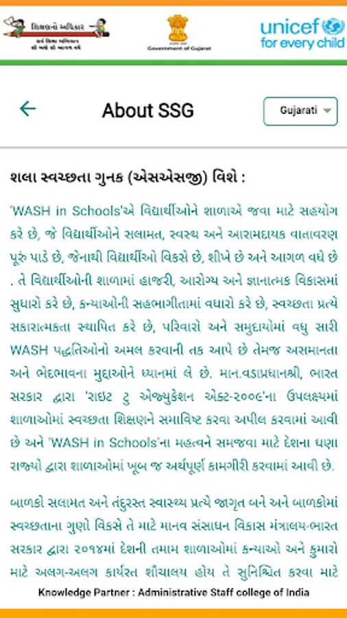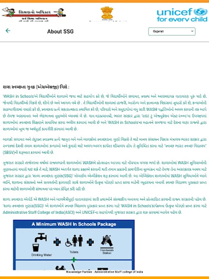 ShalaSwachhtaGunak (SSG) is a real-time WASH benchmarking and capacity building program initiated by Government of Gujarat with the leadership of SamagraSiksha, Gujarat and support of UNICEF.