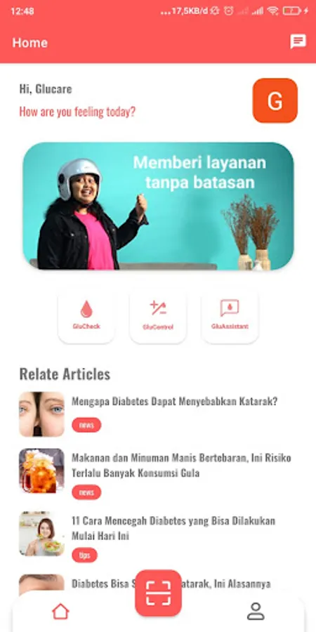 Glucare is a technological innovation in the health sector that serves users via a smartphone. Glucare was created with the aim of making it easier for people to detect diabetes early. The main features of GluCare are Glaassist, GluControl, and GluCheck. We believe that the ease of taking care of your health can be started from simple steps.