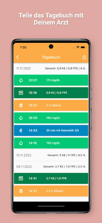 Manage all your data in one place, export the diary as a .pdf file and easily share it with your doctor or diabetes advisor. Use reminders to not miss anything important.