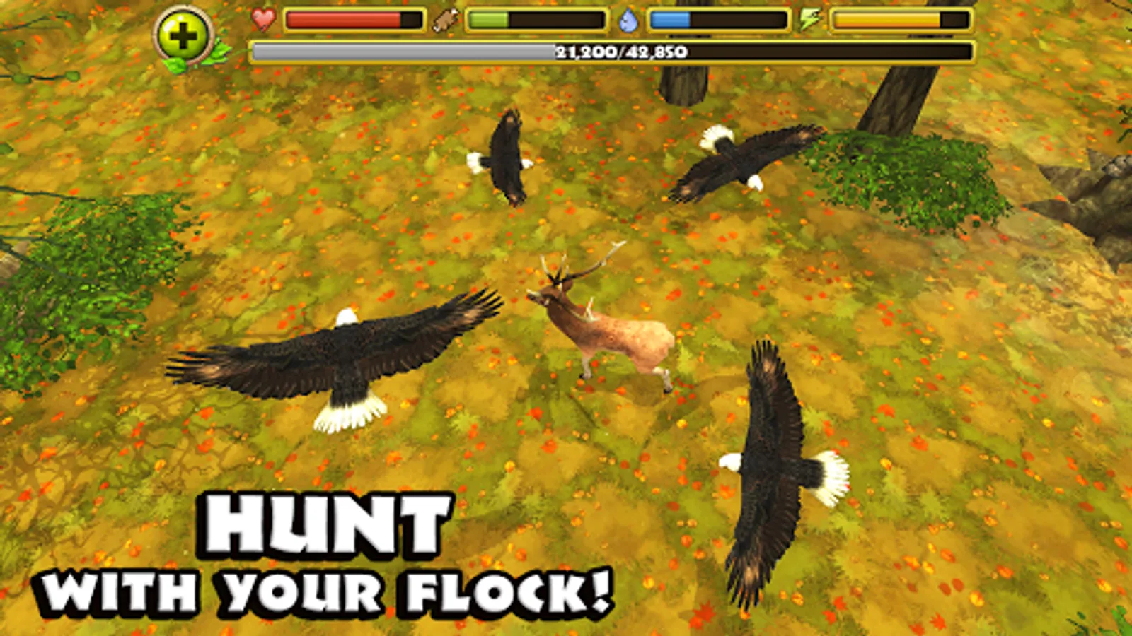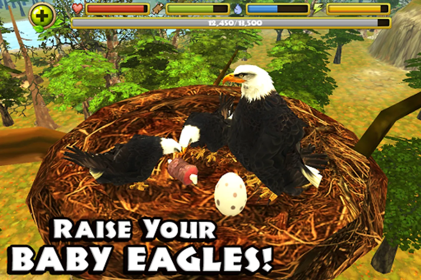 + START A FLOCK OF EAGLES - Find a mate to bond with and raise your very own family of eagles to help you hunt! Watch your babies hatch and grow in size as they assist you in combat!