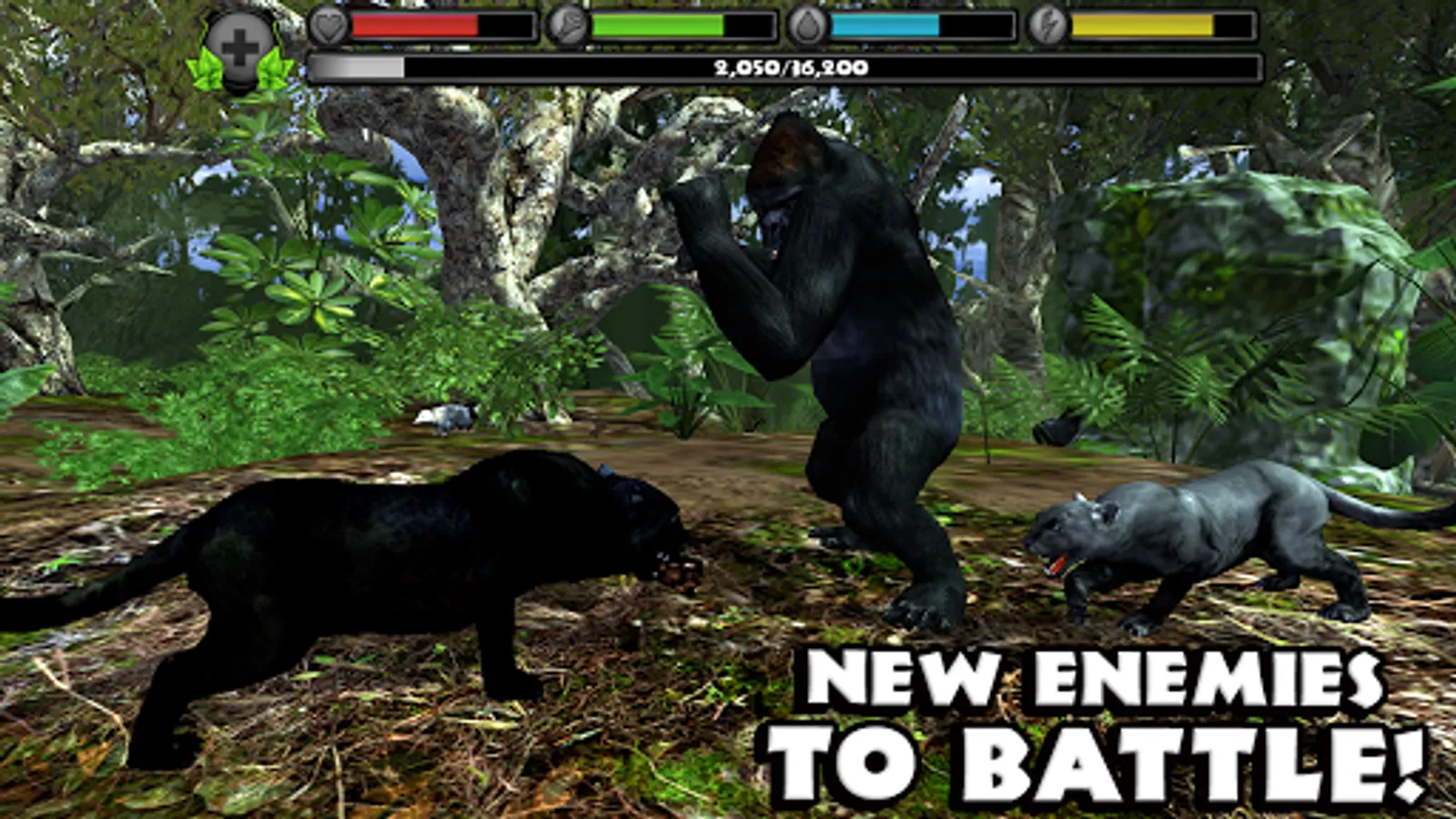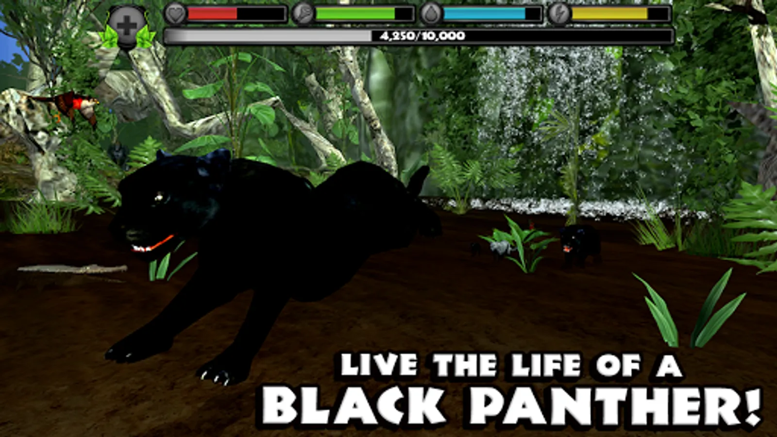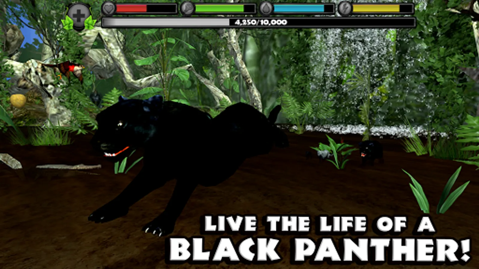 Gain experience by defeating dangerous predators, eating small animals, and completing missions. Level up your panthers to increase their health and attack damage, unlock new fur colors, and gain new powers like Predator Vision!
