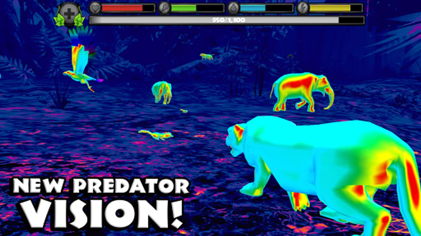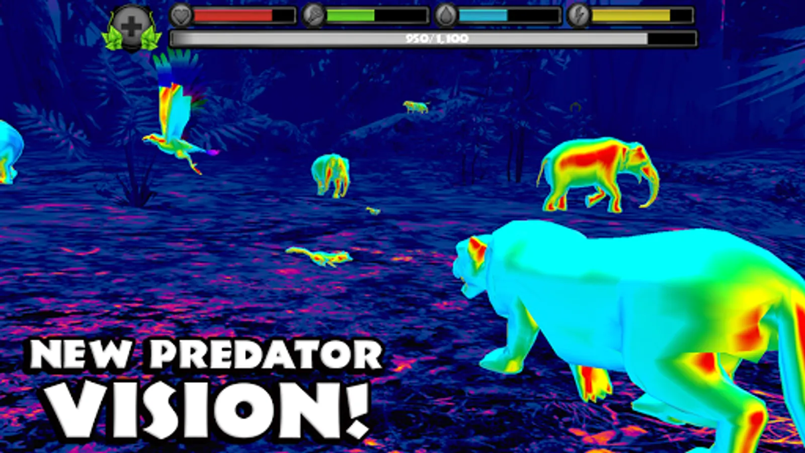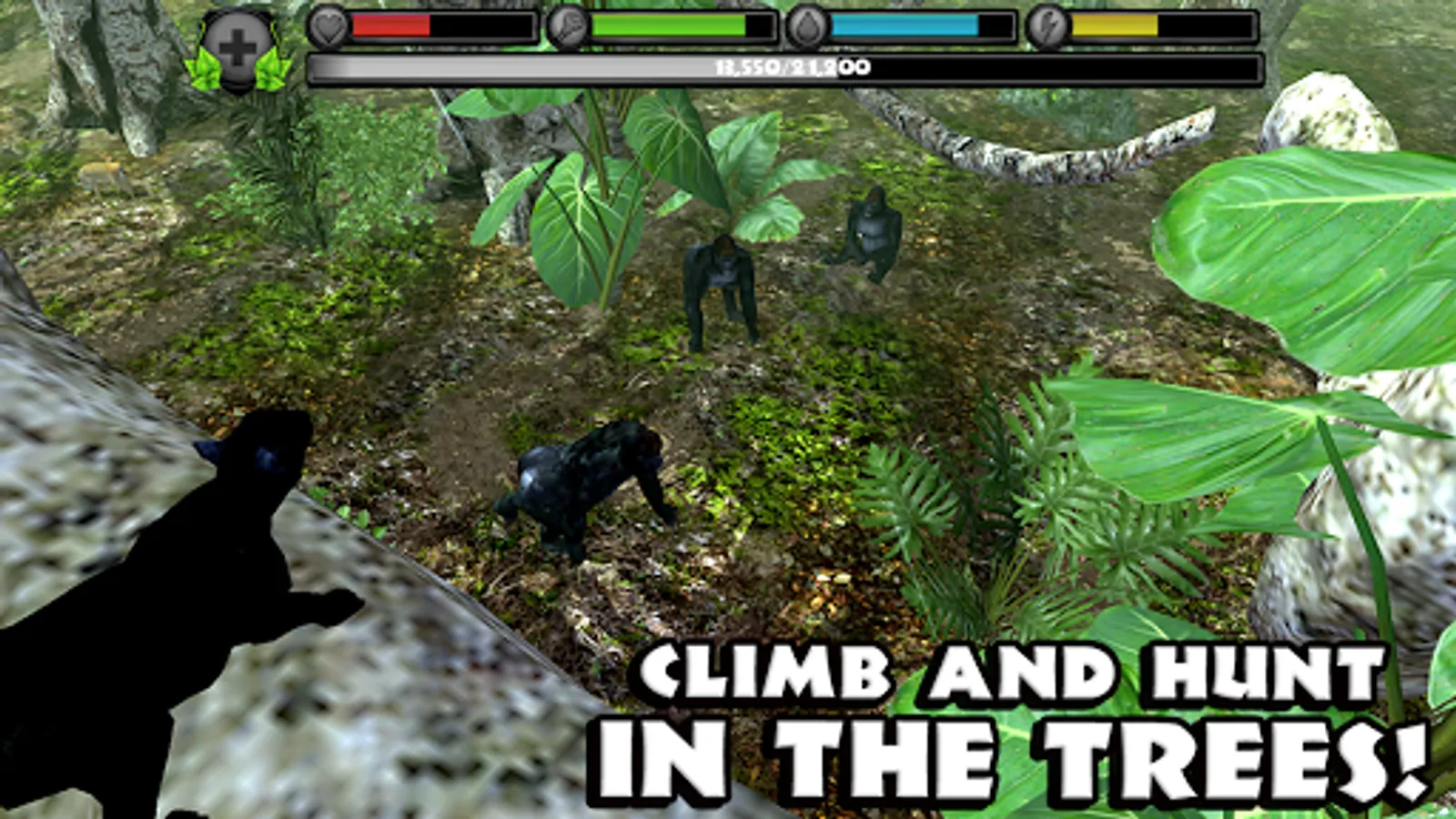 Gain experience by defeating dangerous predators, eating small animals, and completing missions. Level up your panthers to increase their health and attack damage, unlock new fur colors, and gain new powers like Predator Vision!