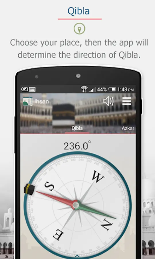 3- Qibla, here you can detect your location, where all you need is to open the app and choose your place, then the app will determine the direction of Qibla.