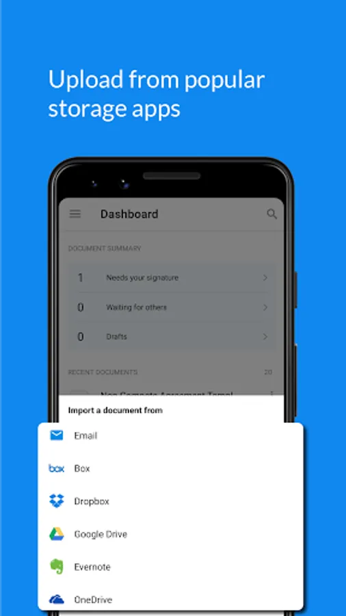 Import and save signed documents to your favorite cloud storage apps in Google Drive, Dropbox, Box, OneDrive, and more.