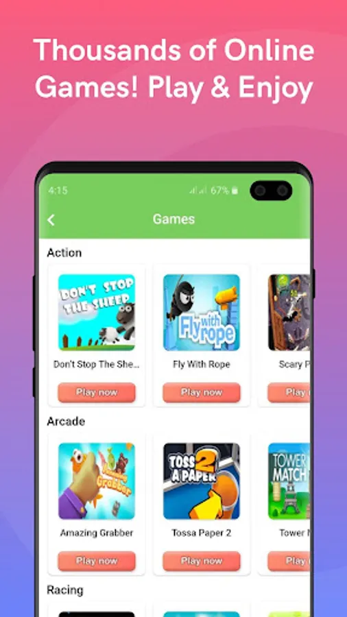 •Games: Wide range of amazing online games of various types like; Adventure, puzzle, action, racing, strategic and many more.