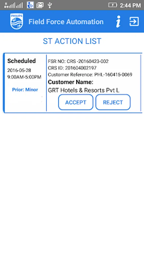 Philips Lighting Field Force Automation Application (FFA) is an android application for Philips Service Technicians to capture field service information in real time or offline using mobile phones. The captured field service information is transferred immediately to back-end systems through wireless connectivity (Wi-Fi, 3G/4G with GPS). This instant capture of service information reduces time delays, avoids manual double entry data errors and enhances field force productivity. This field service force application provides a simple, usable, user interface for the mobile, and data transfer of the information captured at Customer Site.