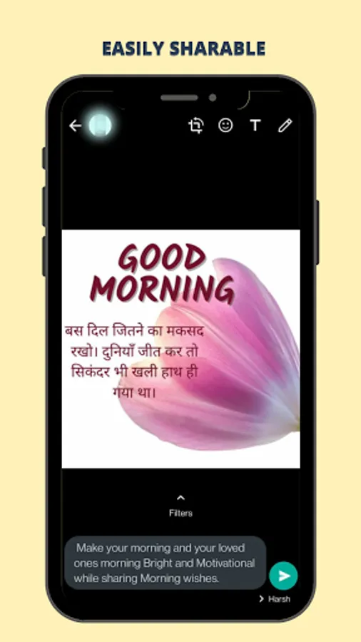 There are two sections in this app, morning motivation quotes and good morning quotes in Hindi so the person who only know Hindi language also can use this app and share images. This app is having wide range of romantic morning quotes and morning happy quotes . You can share this quotes to your friends and make there morning happy.