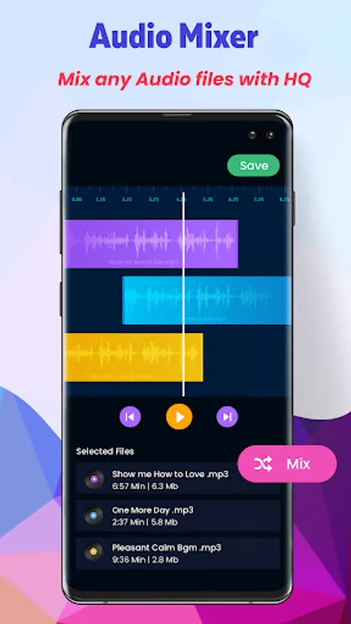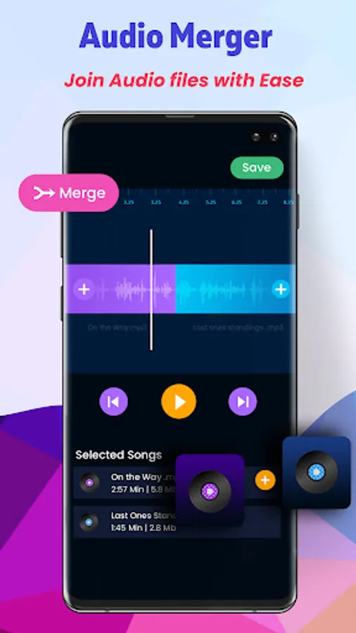 Create new ringtones or new Audio Files by mixing two songs or two audio files playing simultaneously. You can choose two audio files and can mix in a creative way, use the audio songs or files as ringtones.