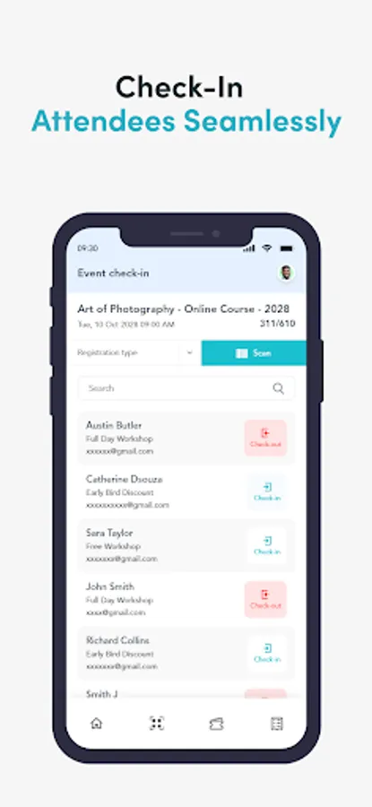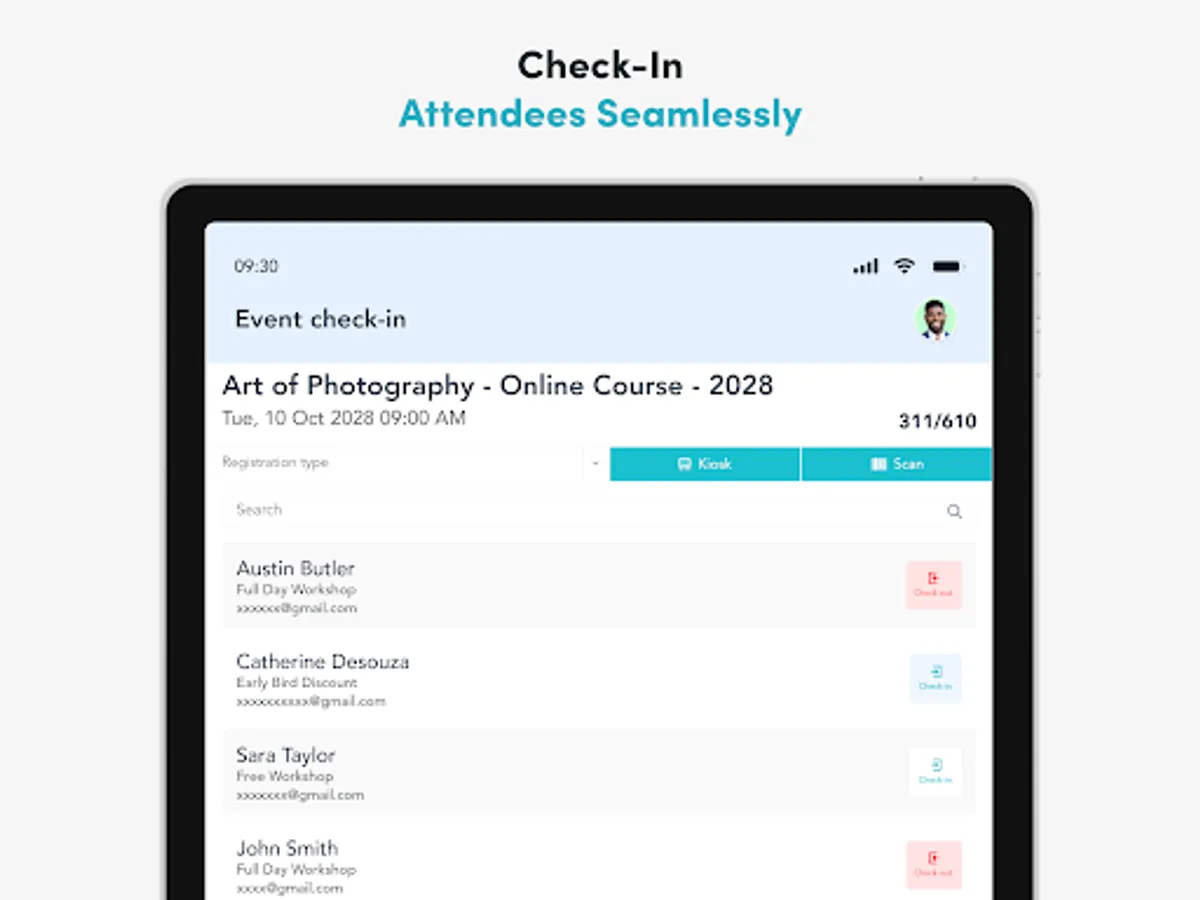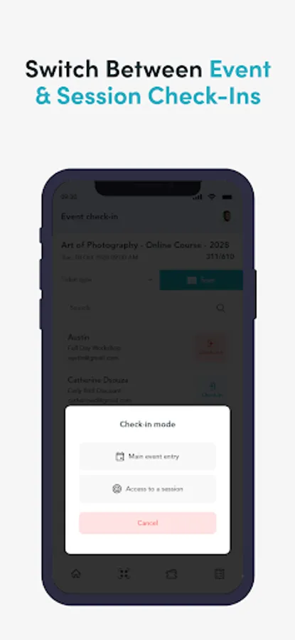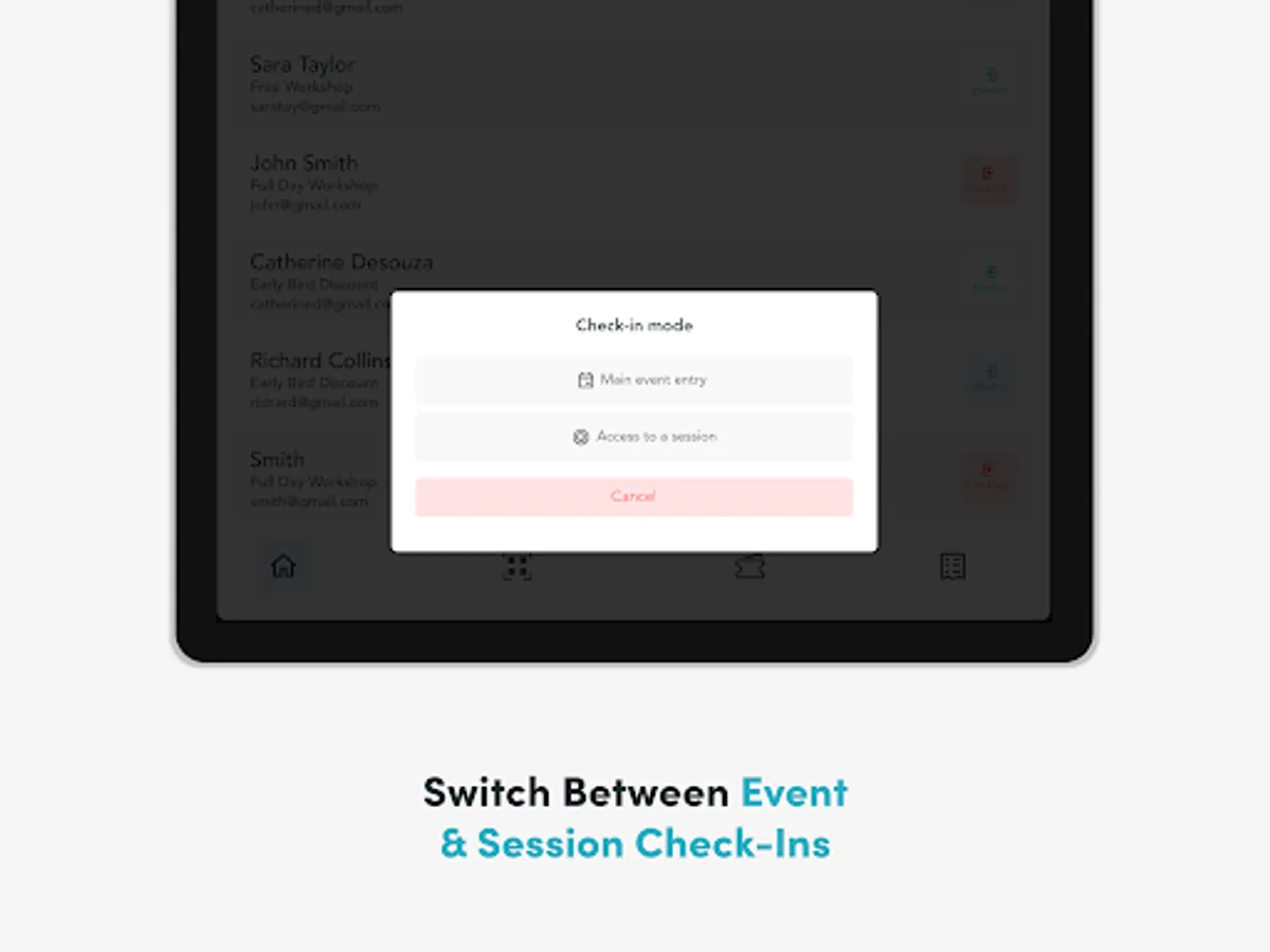 - Easily check in attendees by searching their name or browsing the list (Alternate for scanning the ticket)