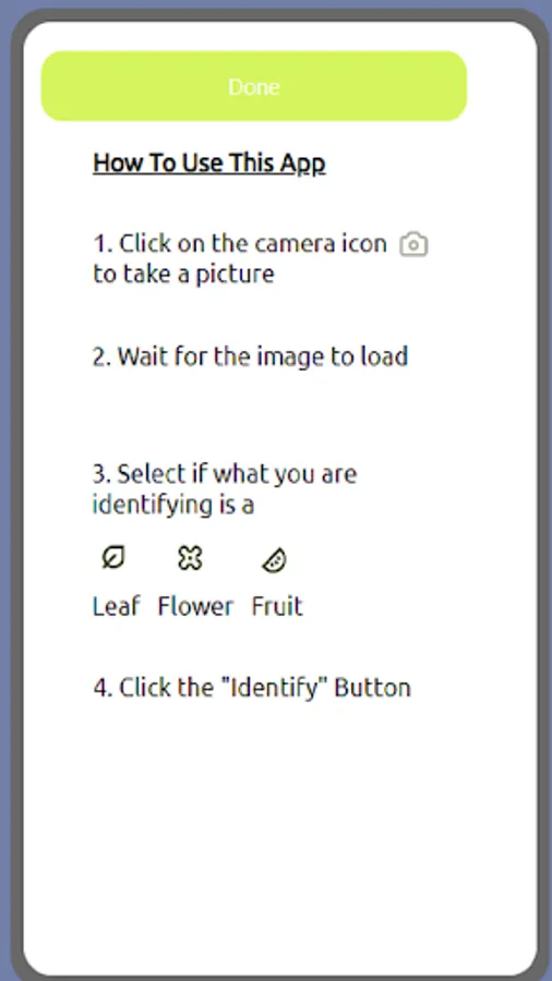 this app provides you names of the plants, flowers and fruits. all you have to is take a picture and then press the identify button. It helps to identify plants, flowers and fruits.
