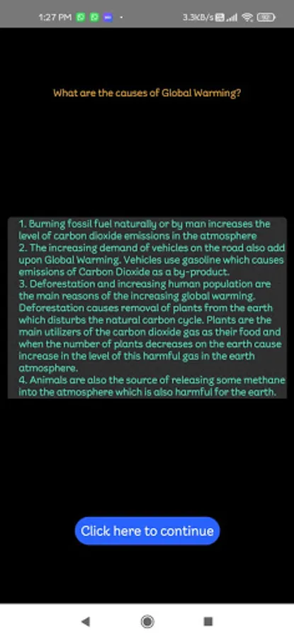 - Information towards CAQ (Commonly Asked Questions) on Global Warming with the help of audio clips inserted into a storage bucket, to improve your knowledge.