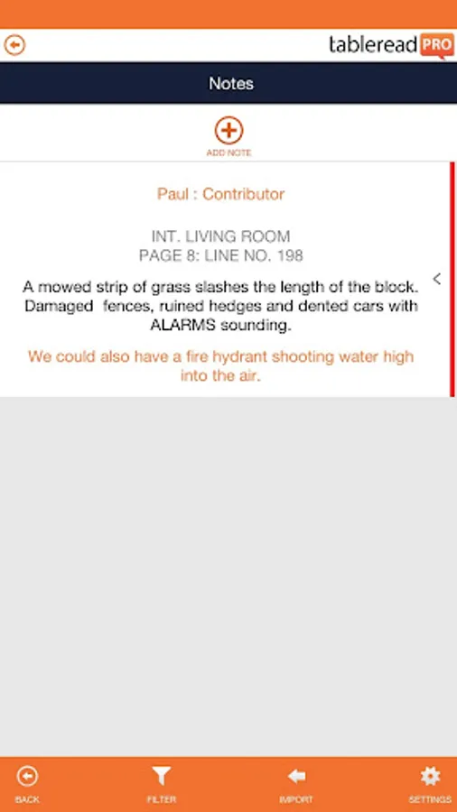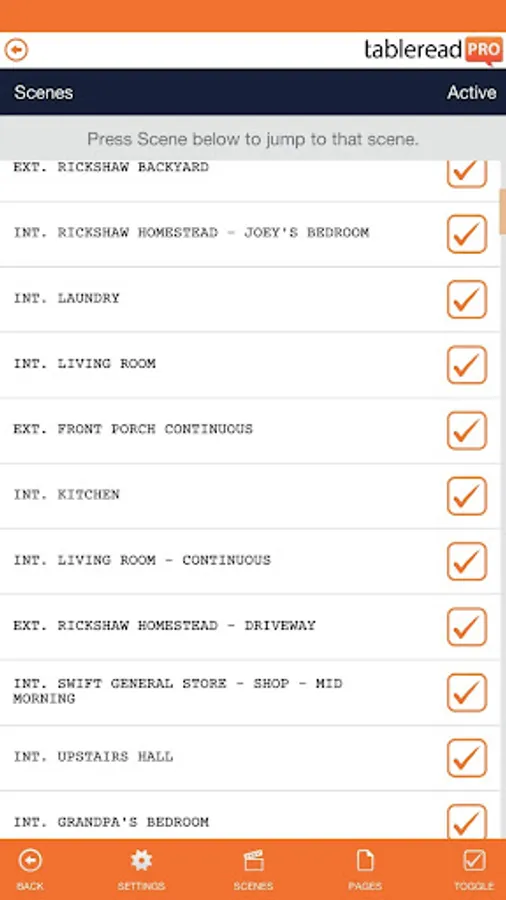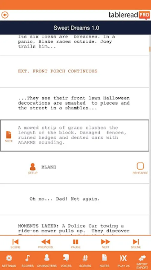 Upgrade to tableread Pro for further functionality. Listen to scripts as read by over 45 unique character voices and add an inspiring soundtrack from a library of genre specific scores. Create and export script notes and utilize powerful rehearsal features.