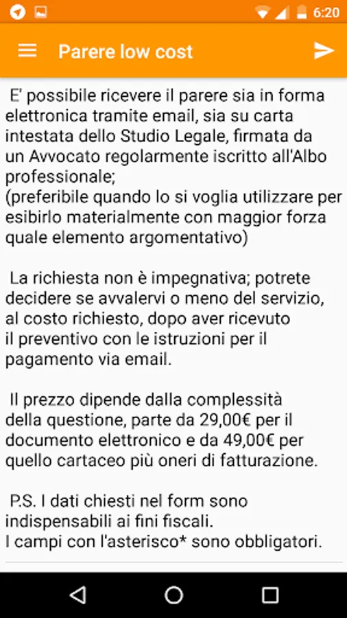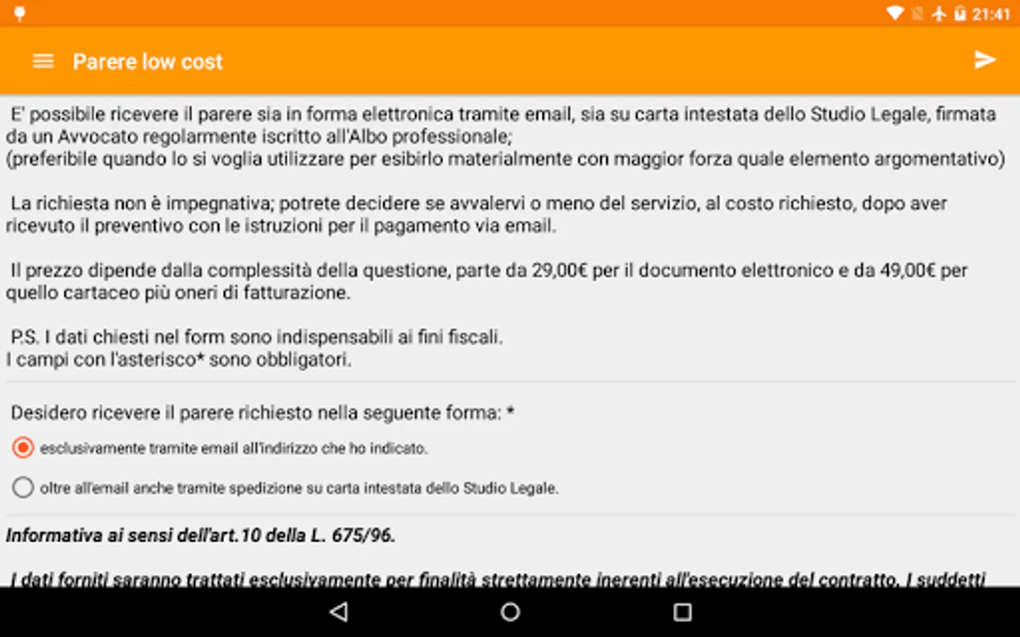 - LEGAL OPINIONS (LOW COST): service through which you can seek legal advice at particularly low cost; the opinion - as well as by e-mail - can also be issued on the letterhead of the law firm, with a signature on a regularly enrolled in the Professional Lawyer.