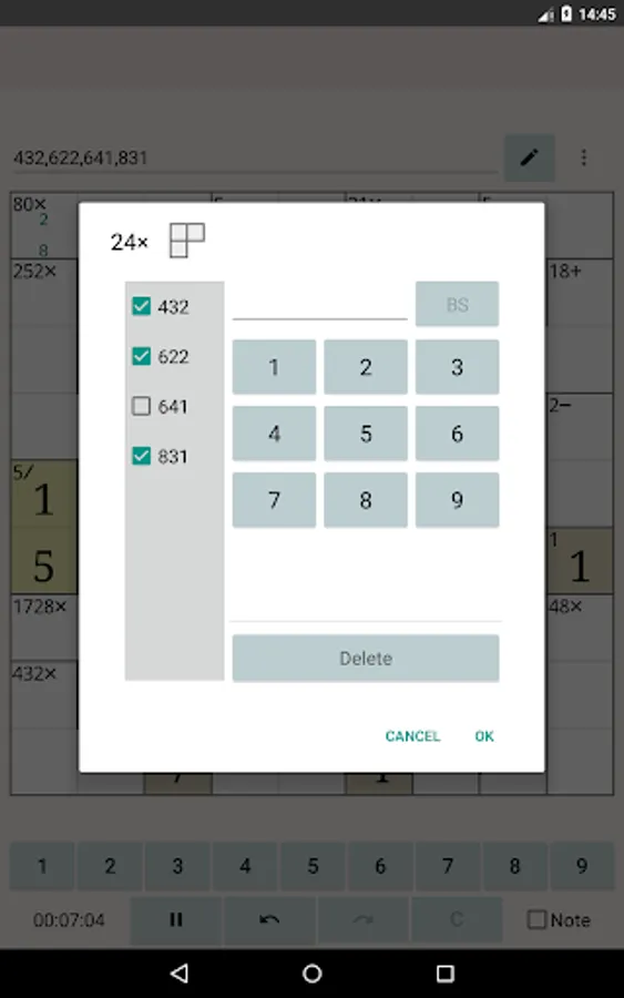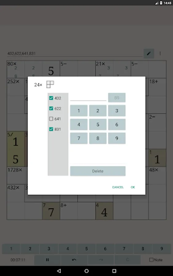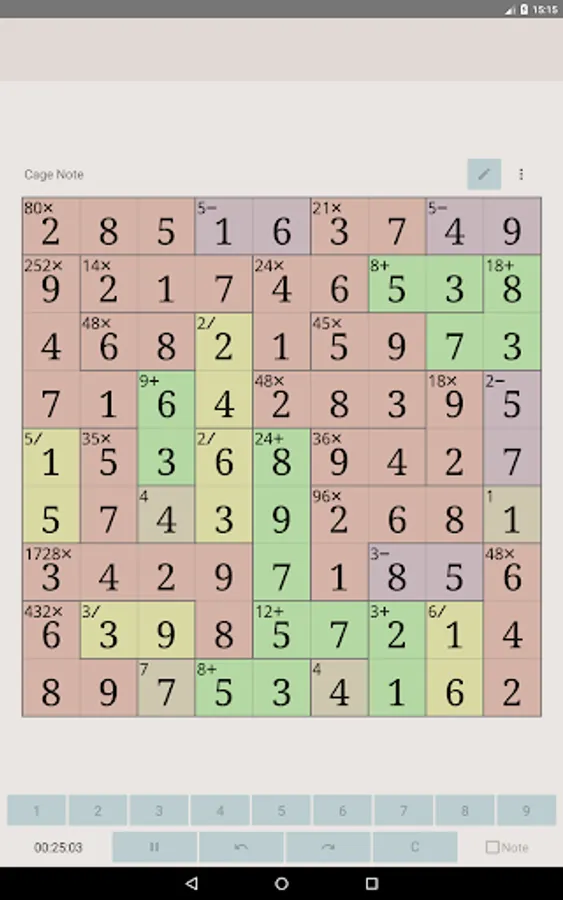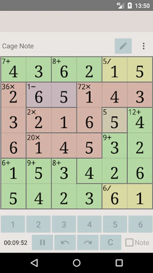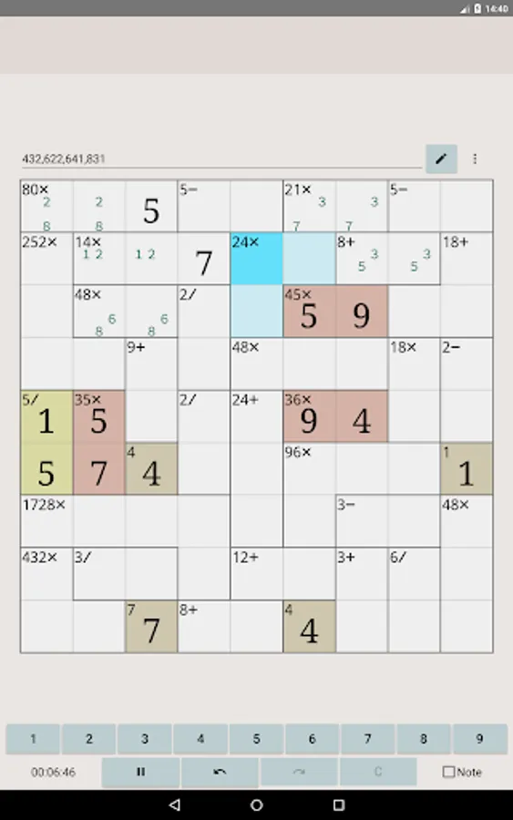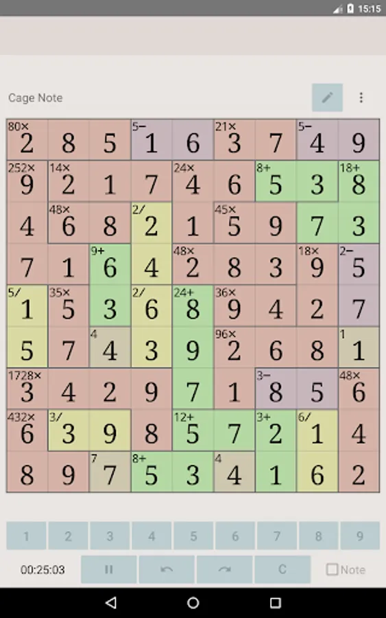 In MathDoku Notable, in addition to being able to note candidates for each cell, you can also note combinations of candidates for each cage. By using the cage note feature, you can solve high difficulty level puzzles more easily.