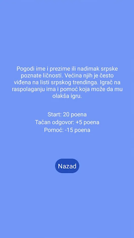 The goal of the game is for the player to guess the name or nickname of a Serbian celebrity based on four illustrations. Most of them are often seen on the list of Serbian trends.