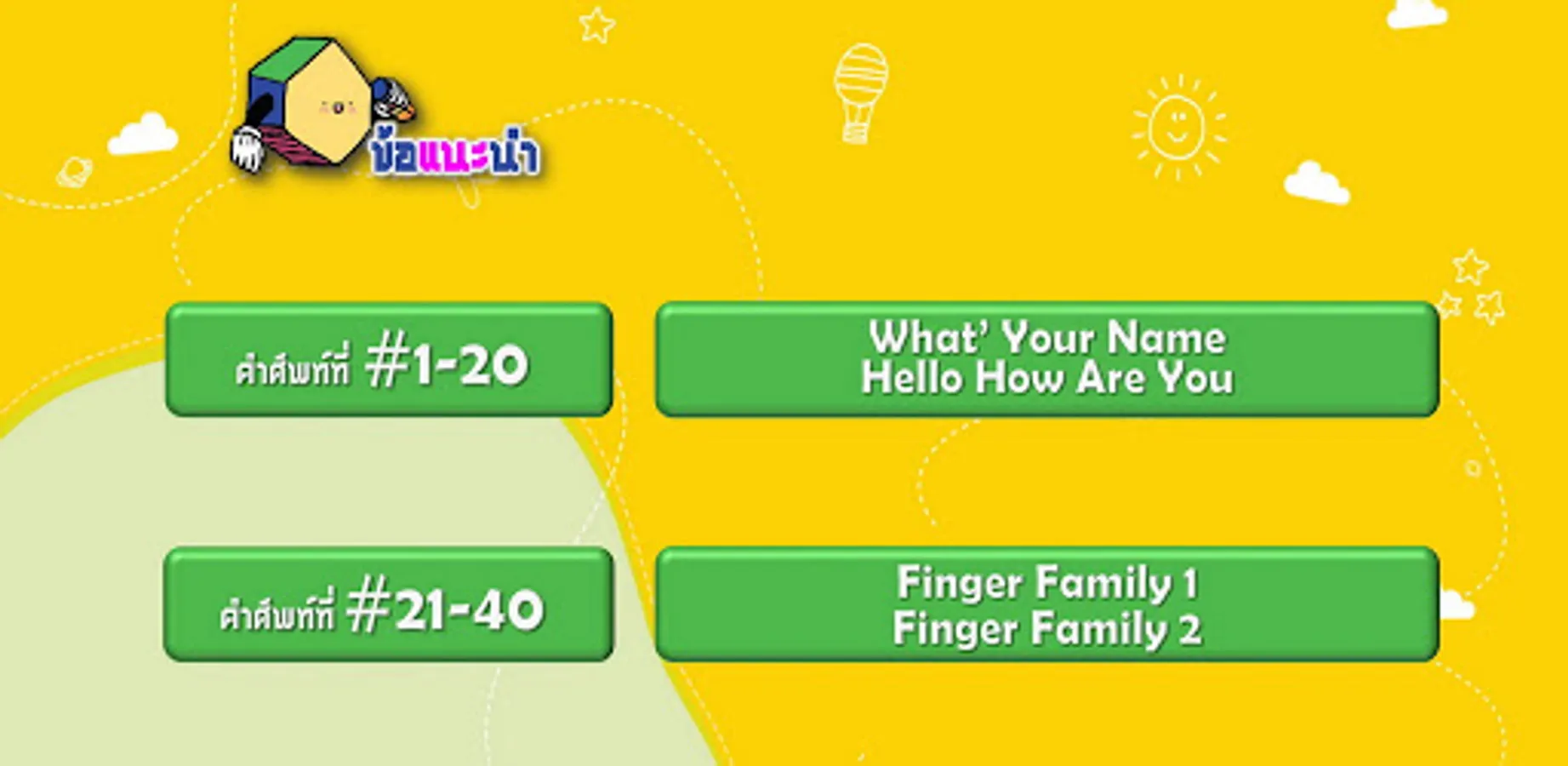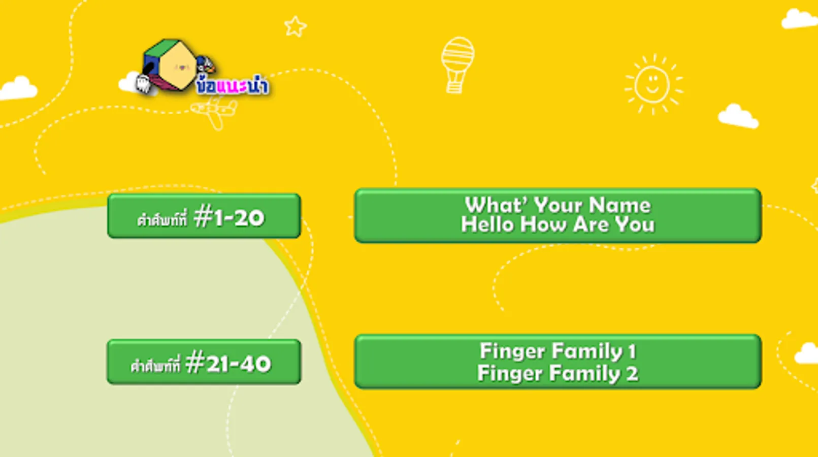 It has been proven that learning with rhymes is good for memorizing. and can be remembered for a long time and can be used with research backing in line with the ministry curriculum Helps to increase vocabulary power quickly. Suitable for young children who are beginning to practice speaking. Kindergarten children starting school Elementary school children who start reading and for adults who want to learn with children in a fun way