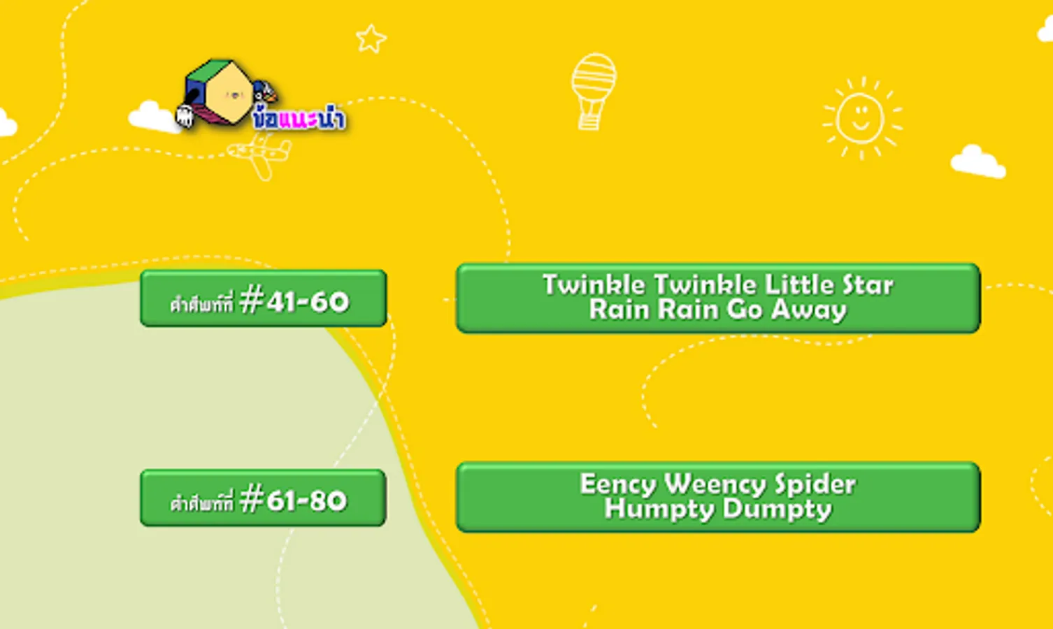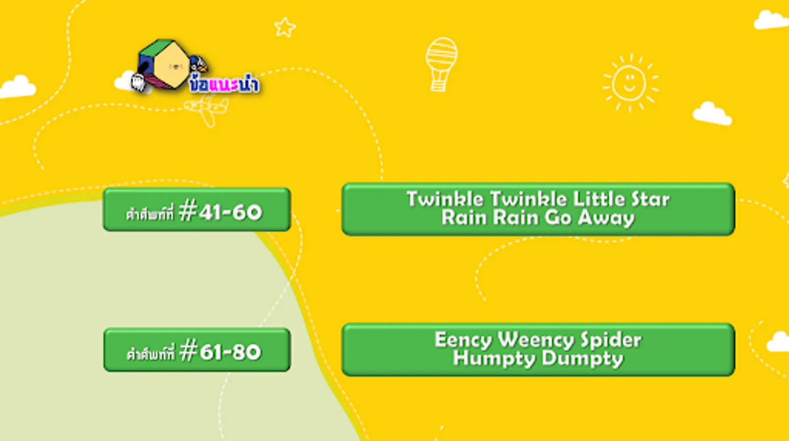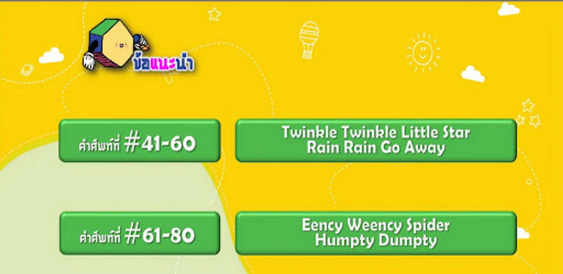 It has been proven that learning with rhymes is good for memorizing. and can be remembered for a long time and can be used with research backing in line with the ministry curriculum Helps to increase vocabulary power quickly. Suitable for young children who are beginning to practice speaking. Kindergarten children starting school Elementary school children who start reading and for adults who want to learn with children in a fun way