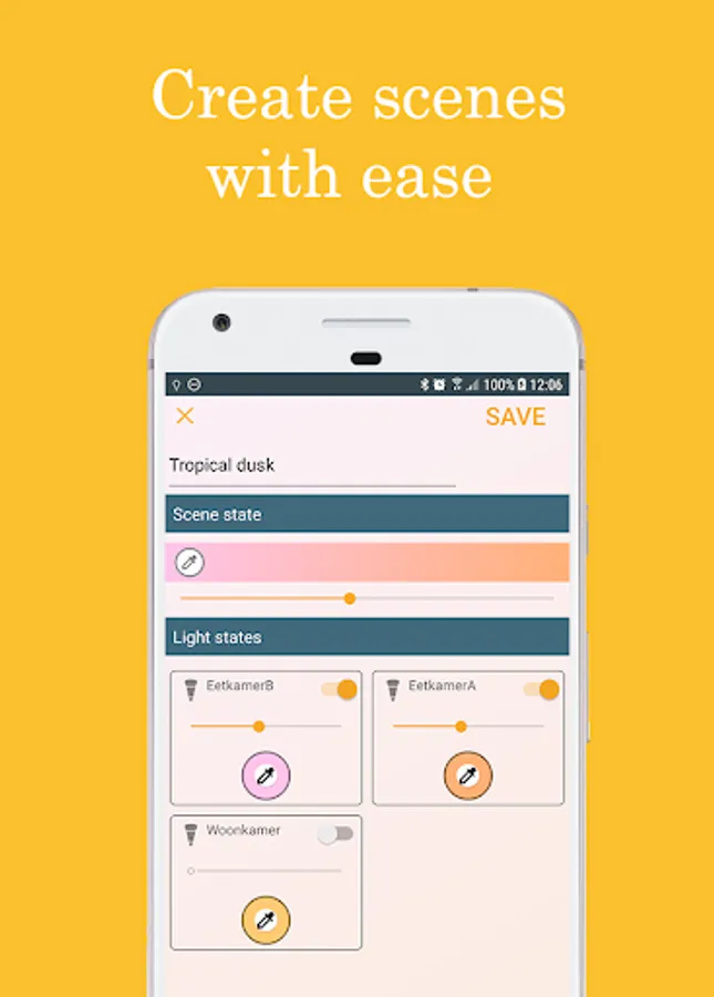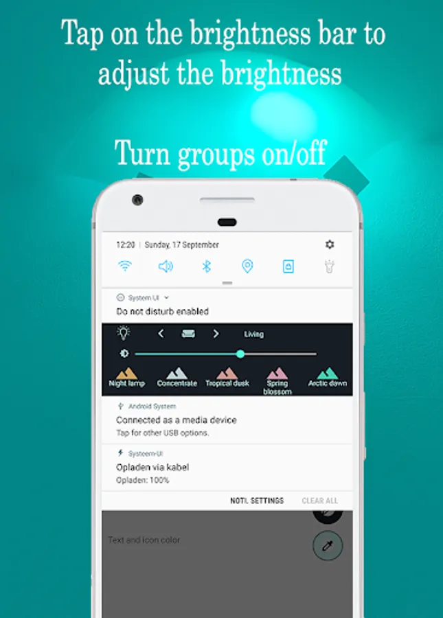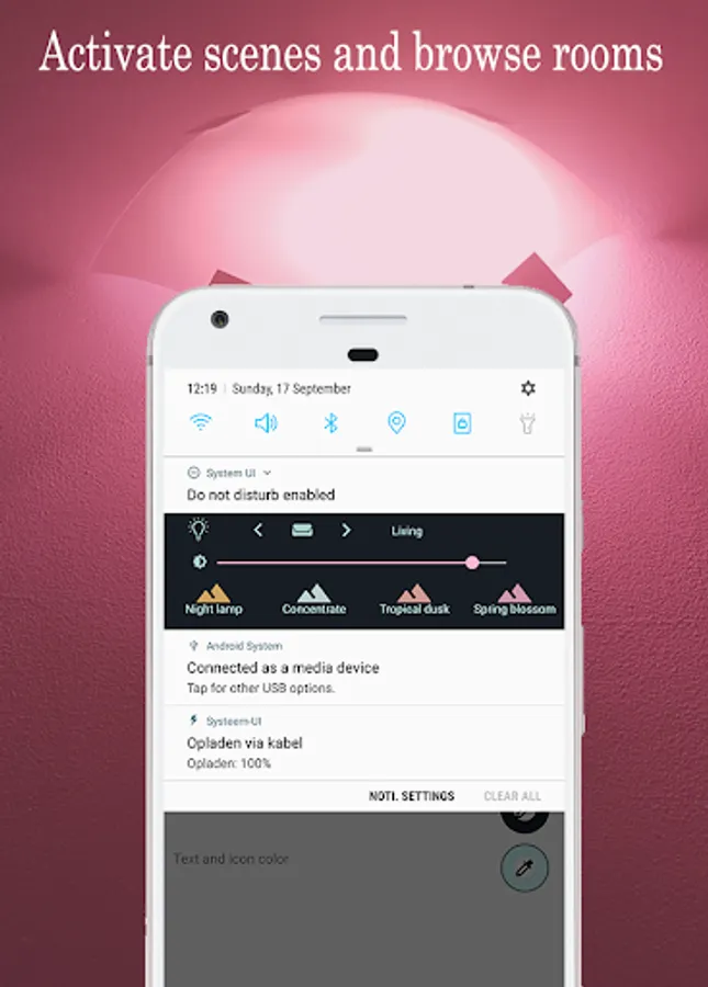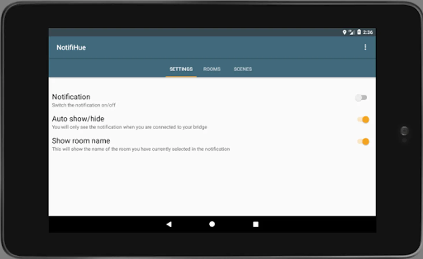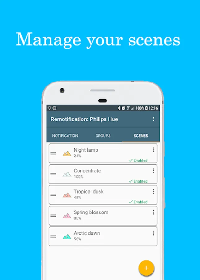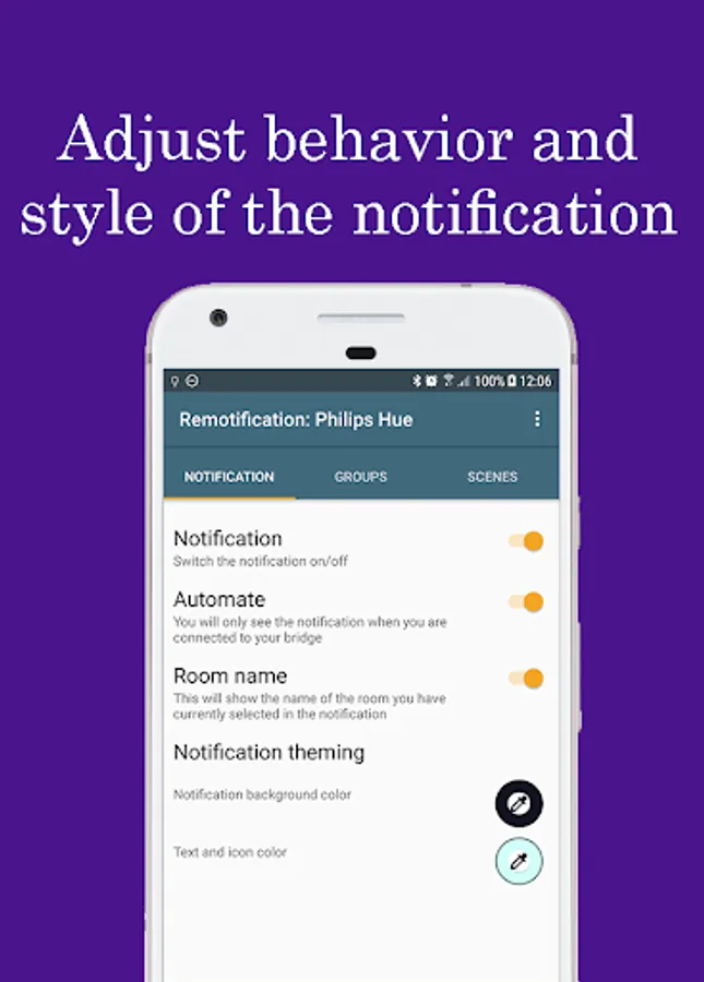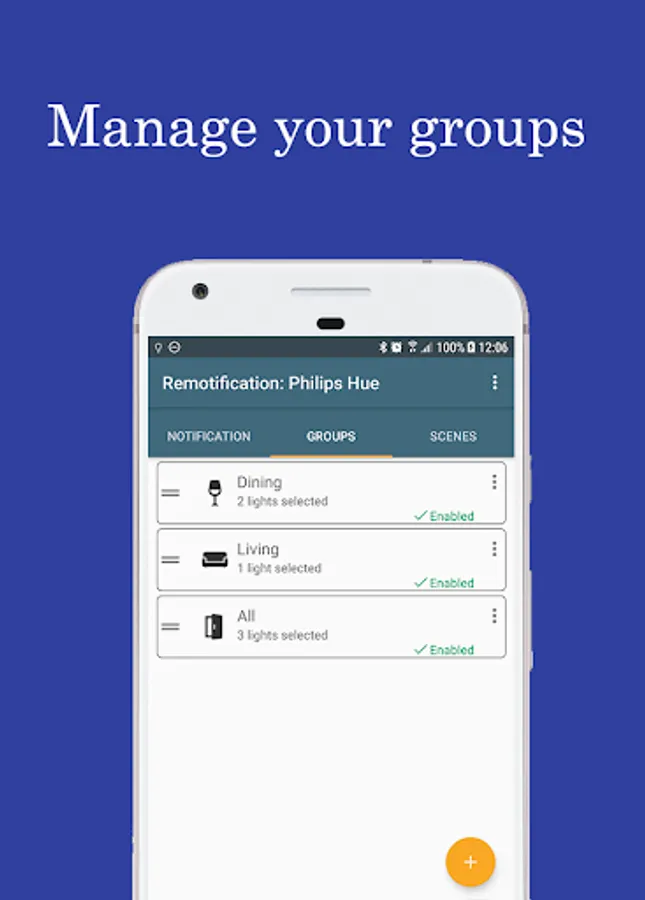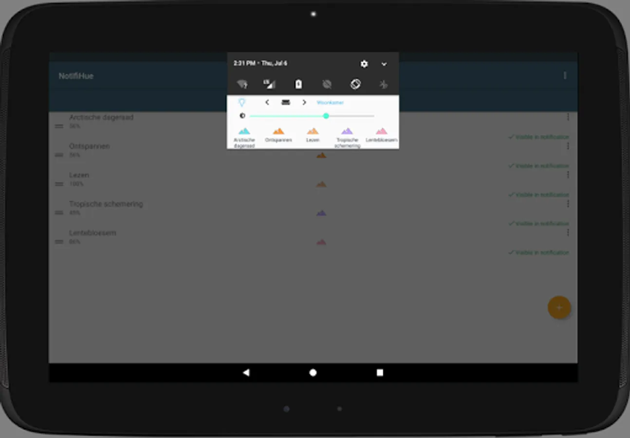 Remotification: Philips Hue makes operating your Philips Hue lamps even easier. Connect the app once with a Philips Hue Bridge and all rooms and scenes are taken over in Hue Notification Control. In addition, it is possible to create your own groups and scenes. You can then choose which rooms and scenes you want to control from the notification. This notification will disappear when you leave home, and will appear again when you arrive. All of your creations, rooms, scenes and settings, are synchronized on all of your devices. You just have to sign in using the same Google account.