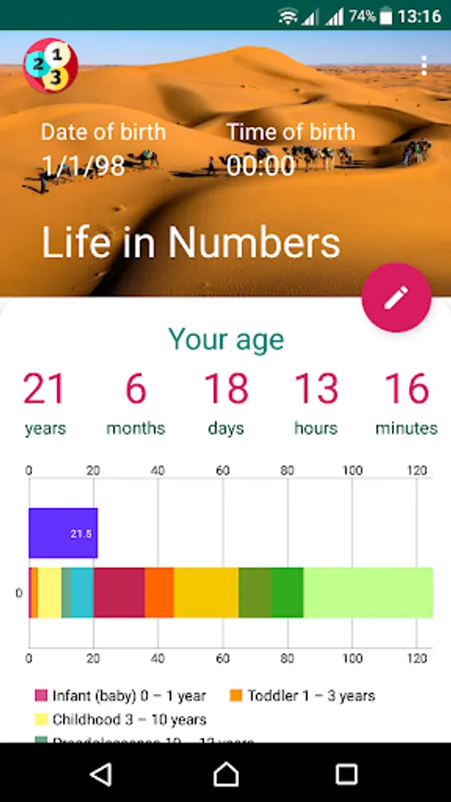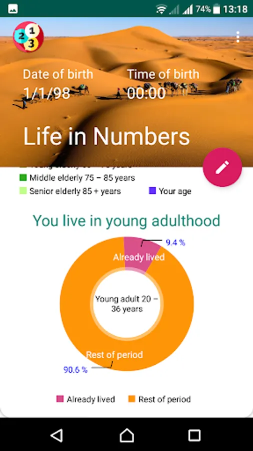 - information on life expectancy, how much you have already lived from the average life expectancy and maximum life expectancy;