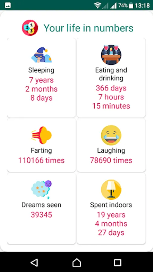 - how much you slept through in your life, how much time you spent on food and drink, how many dreams you saw and other information based on average data.