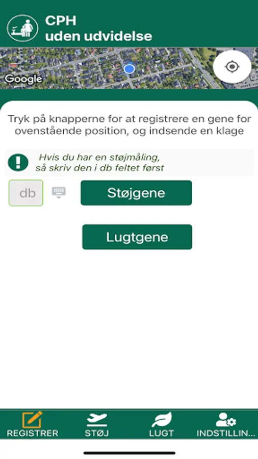 With "Environmental meter - CPH without extension" you as a citizen can register the noise and pollution nuisance you observe from Copenhagen Airport (CPH) and easily send a complaint to the Danish Environmental Protection Agency.