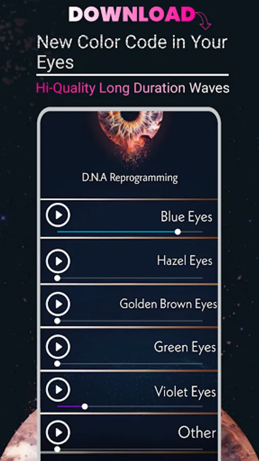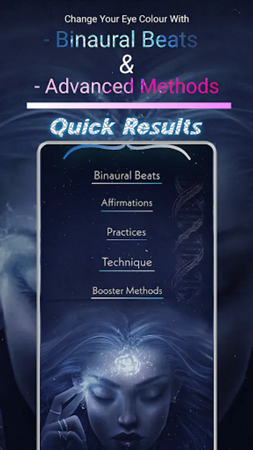 We have done too much research and make high quality frequencies for you. which you will not find anywhere else. with these binaural beats ( brain waves ) you can change the color of your eyes , skin and hair within 3 months. this will Safely reprogram your D.N.A . in this application, we have given full package of every single detail which will help you a lot. These beats heal up your biokinesis ability & its effective on all eye colors Like:- blue eyes , green eyes , hazel eyes , red eyes , violet eyes , golden brown eyes & other.