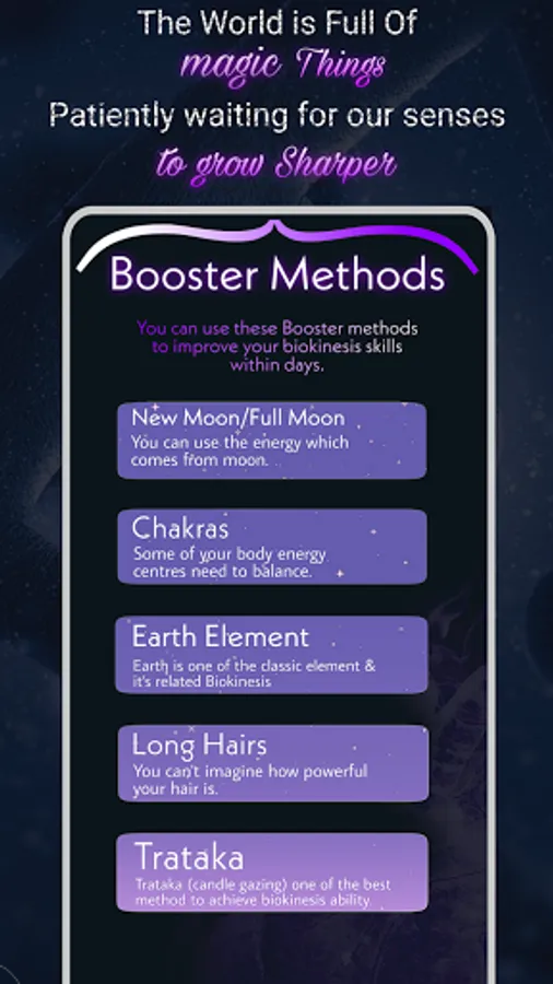 Are You Psychic? If yes so this biokinesis training app helps you a lot. you can test your psychic abilities. but its not about zener cards or clairvoyant test. if you want clairvoyance development then balance your 7 chakras and third eye (sixth sense) etc. moreover there is not any intuition games & tarot. but fully loaded with intuition training (poderes psíquicos)(intuicion magica). these brain waves(music) also help in astral travel (astral projection ) (viajes astrales). & it helps in all the psychic powers or psychic abilities like psychokinesis , lucid dreaming , trataka(candle gazing) , electrokinesis , telepathy communication , third eye (sixth sense) , aerokinesis , pyrokinesis , levitation , but this app is mainly designed for Biokinesis .