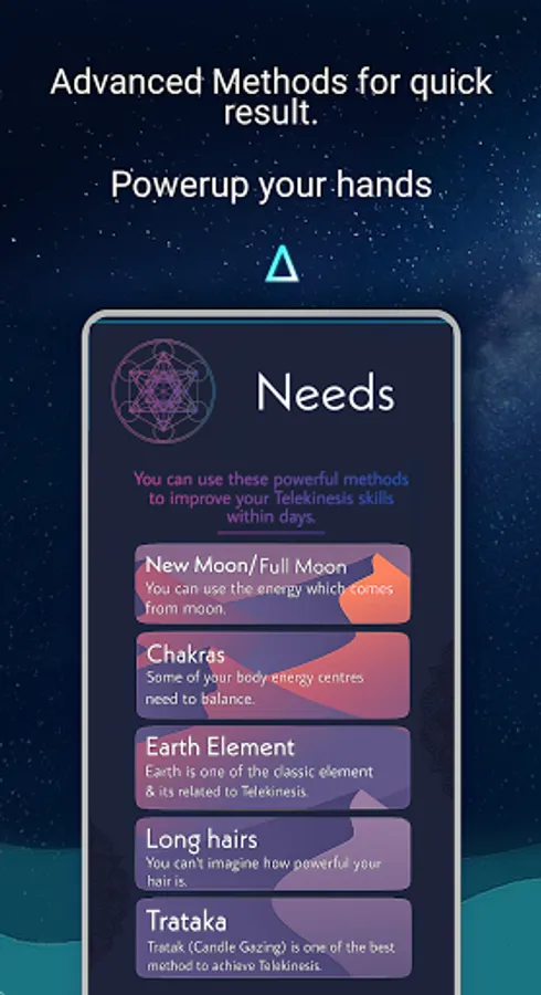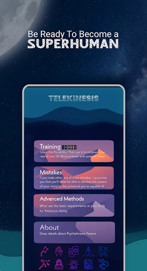 this telekinesis training app helps you a lot. this app is fully loaded with exercises. its like Goku's Kamehameha . so develop your superhuman abilities with us. if you want to improve you intuition power & clairvoyant powers so you can check our another which name is 7 chakras activation binaural beats meditation. and our biokinesis app is coming soon. you can learn secret theories and scientific studies about TK telekinesis . telekinesis is term of psychokinesis . if you want to learn other psychic abilities like , electrokinesis , hydrokinesis , pyrokinesis , levitation , trataka , intuition power , lucid dreaming , astral projection , telepathy ( telepathic communication through your mind power ) & aerokinesis so you can start from tele. (Tk) . after the 21 days training . you can test your psychic power with zener cards or tarot reading or another psychic test.