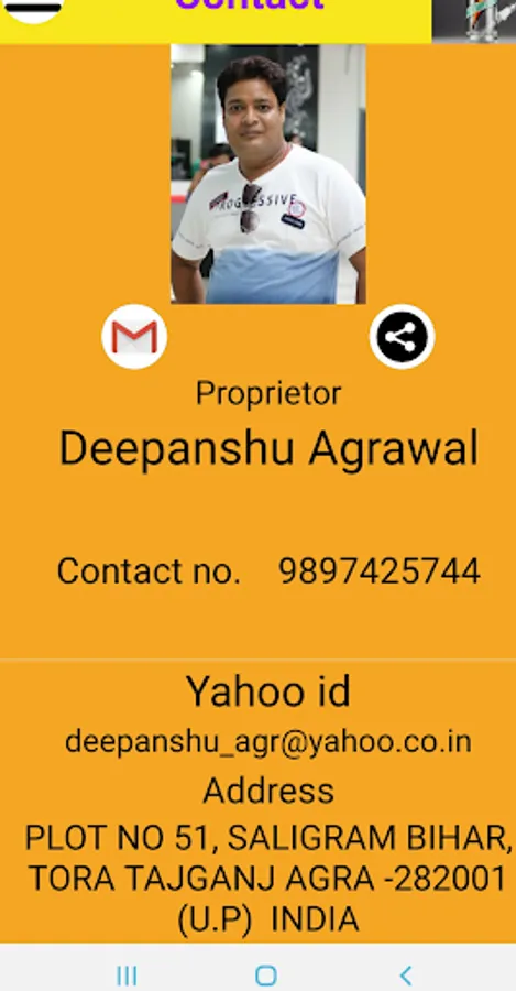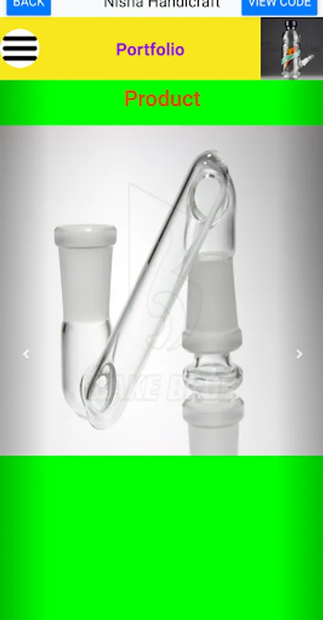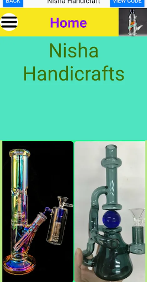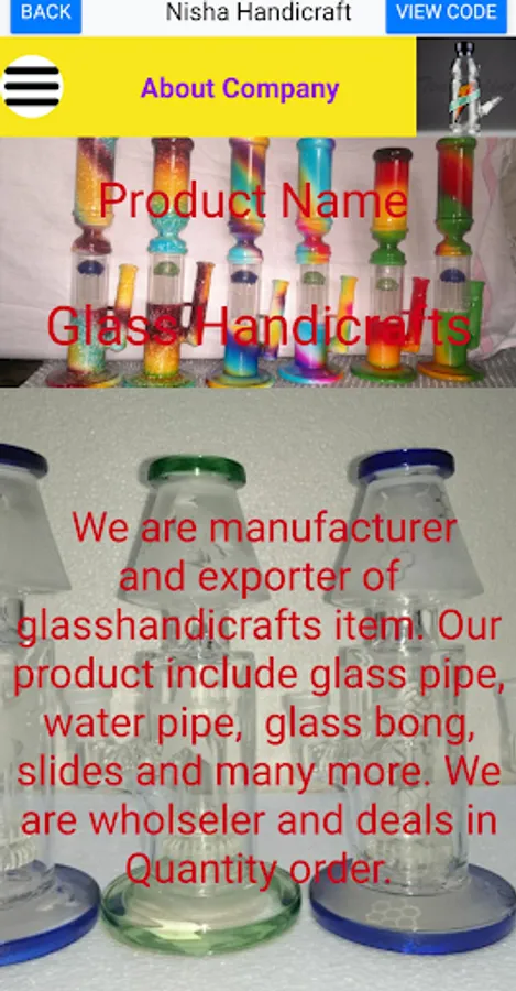 It is a app for company Nisha Handicrafts in Agra. It has four screen. First screen is home screen. Second screen is about company. Third screen is portfolio. Fourth screen is contact screen. In first screen there is name of company and a photo on top left there is button which help to go to other screen. In second screen there is name of product and about compony and on top left there is button which help to go to other screen. In third screen there is photo of product and on top left there is button which help to go to other screen.In fourth screen there is name of propriter and contact no. and yahoo id and address and on top left there is button which help to go to other screen.