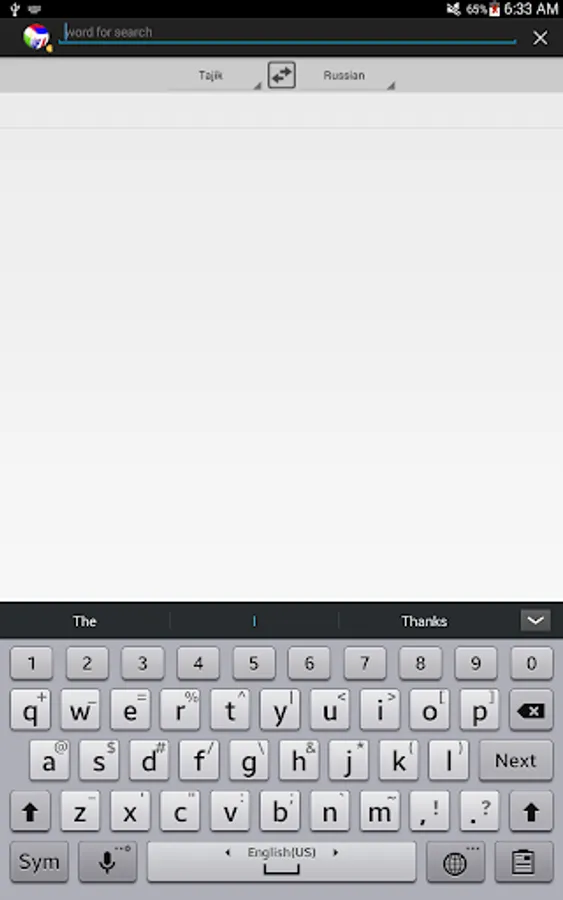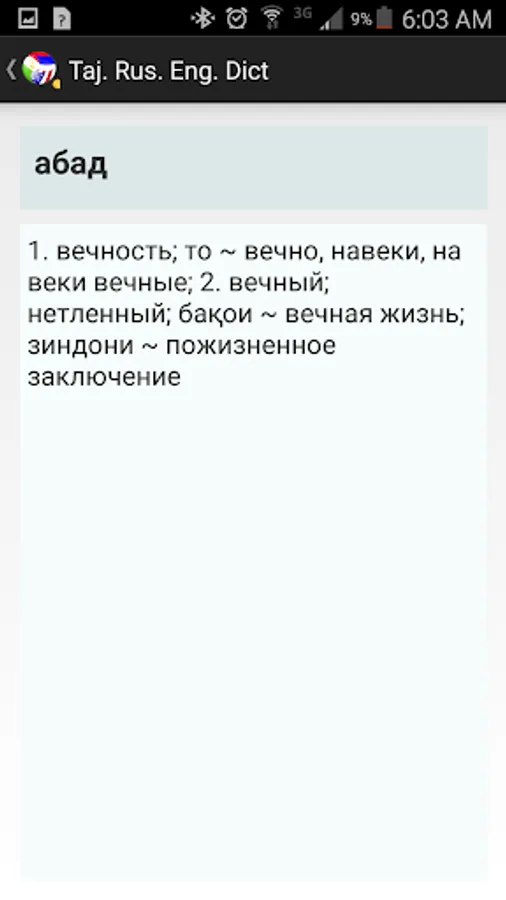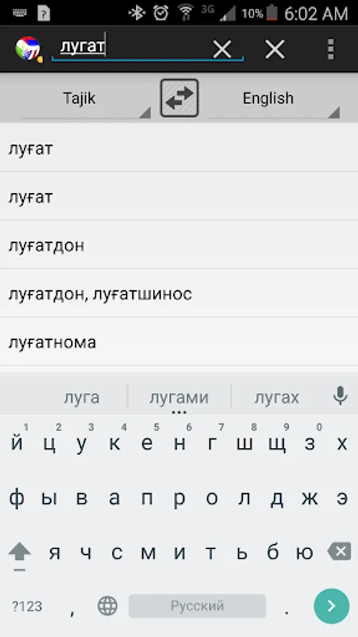 This dictionary includes 230 000 word in all 3 languages Tajik, Russian and English and can translate from any language (listed) to any other (listed). "Ё, Й, Ӣ, Ғ, Қ, Ӯ, Ҳ, Ҷ" these letter could be replaced with "Е, И, И, Г, К, У, Х, Ч".