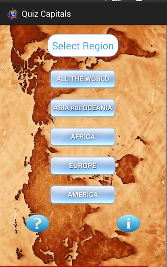 In the starting screen of the quiz choose the continent where you want to test your geography knowledges or if you feel strong enough in geography select to play with the capital cities from all the world.