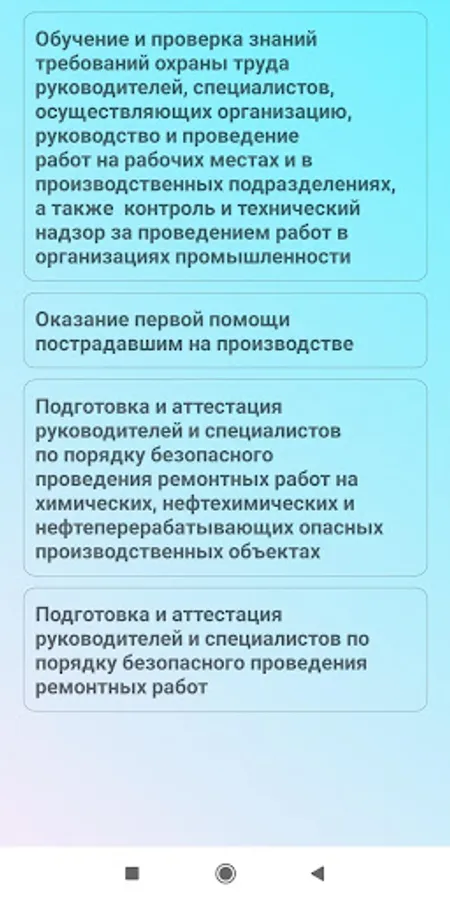 Training and testing of knowledge of labor protection requirements of managers, professionals engaged in the organization, management and execution of works in the workplace and in industrial divisions, as well as the control and supervision of the conduct of work in industry organizations