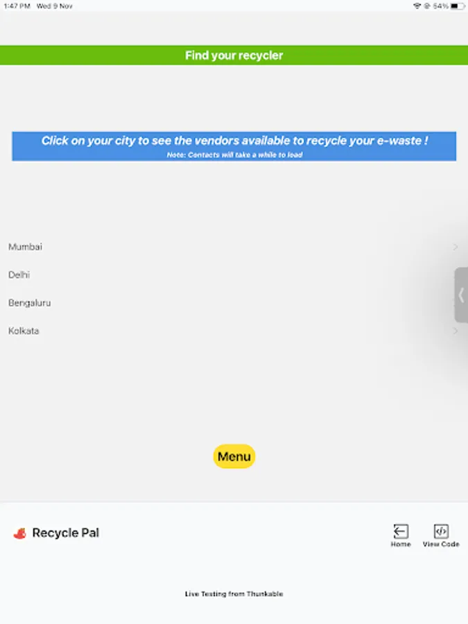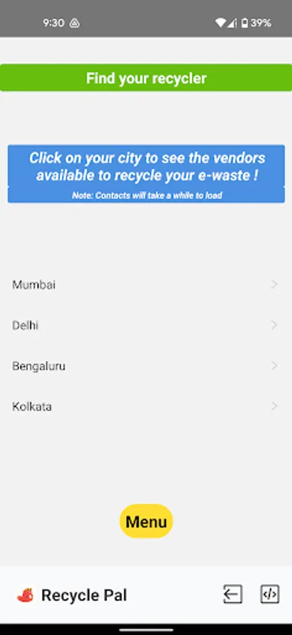 It helps you find your e-waste recycling vendor in your city. It allows e-waste and other type of waste recycling vendors to register themselves so that the users can choose from a wide pool of vendors in their locality. This app is made by 'Code for Change' Team comprising of 12 year old girls ( Swasti, Dhriti, Sara and Jazaa). Currently the app is applicable for Mumbai, Delhi, Bengaluru and Kolkata.