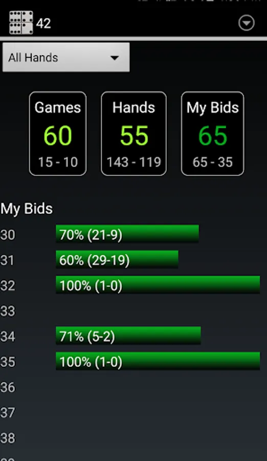 Domino game results are stored locally in your app. Access the statistics and see how you have been measuring up.