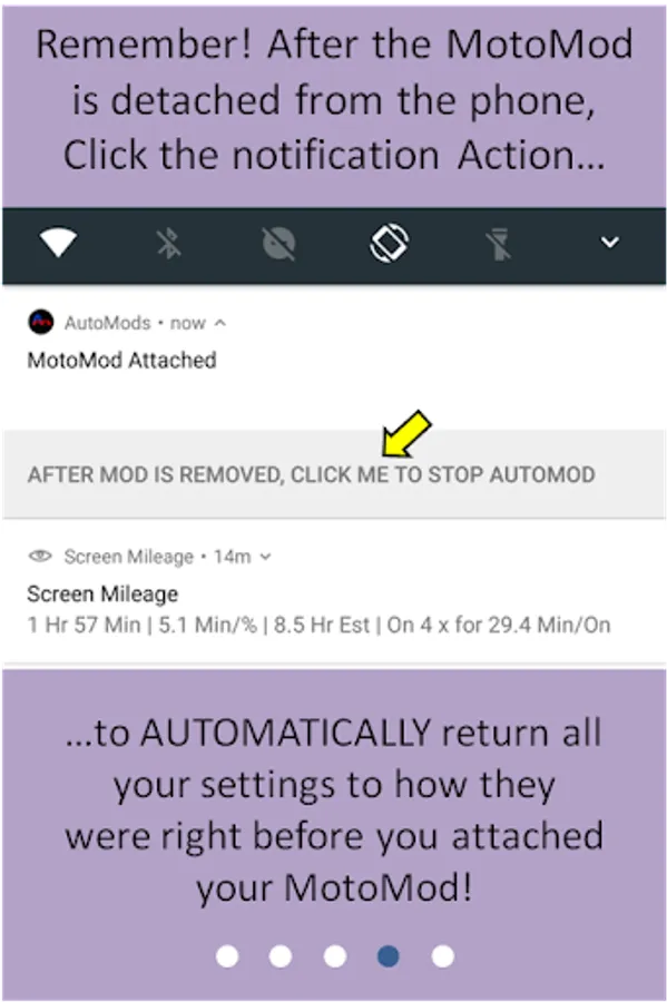 Don't worry about changing all your settings back to the way they were either, AutoMods will return your phone's settings to their original states before you connect the Mod! Simply detach the Mod and tap the AutoMod Notification!