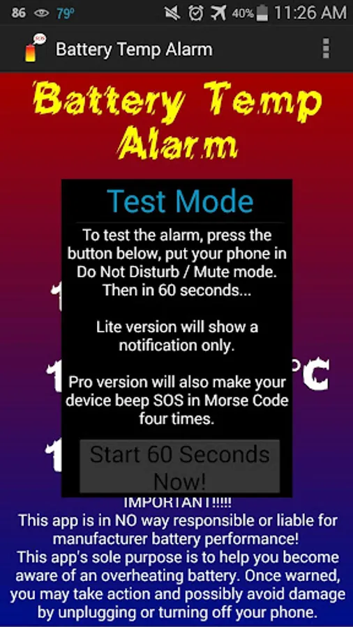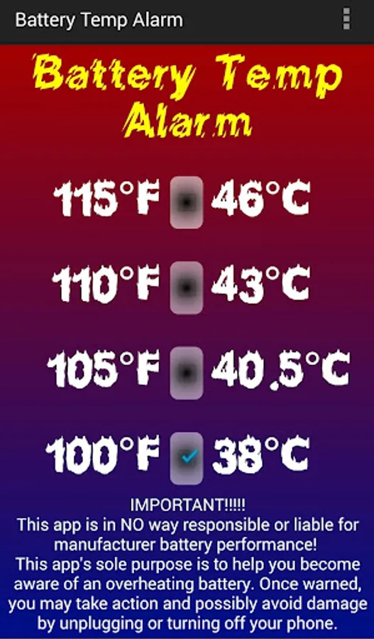 DISCLAIMER: THIS APP IS IN NO WAY SHAPE OR FORM AN INSURANCE POLICY AGAINST YOUR PHONE'S BATTERY MALFUNCTIONING. THIS APP'S SOLE PURPOSE IS TO ALERT YOU WHEN YOUR BATTERY TEMPERATURE IS GETTING TOO HIGH, AT WHICH POINT YOU SHOULD UNPLUG OR SHUT DOWN YOUR DEVICE IMMEDIATELY. DumbSmartApps HAS NO LIABILITY FOR YOUR PHONE'S BATTERY DEFECTS (IF IT HAS ANY) AND SHOULD NOT BE CONSIDERED AN ALTERNATIVE TO THE MANUFACTURER'S ADVISE TO REPLACE YOUR POSSIBLY DEFECTIVE DEVICE.