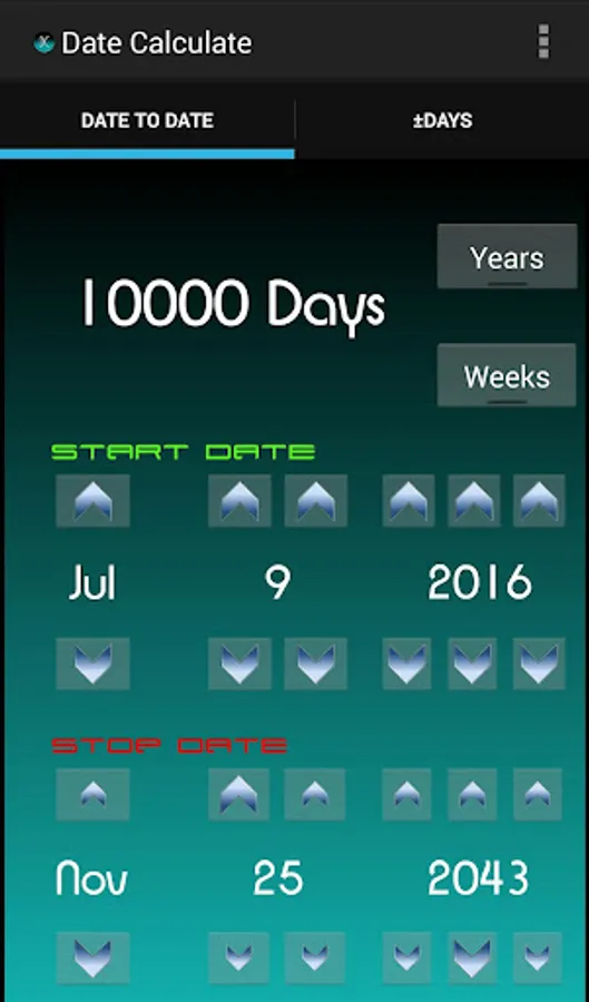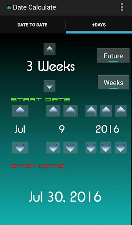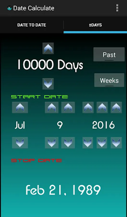 Choose the +/- Days mode to pick a date, add any number of days or weeks in the future or past and get the resulting date!