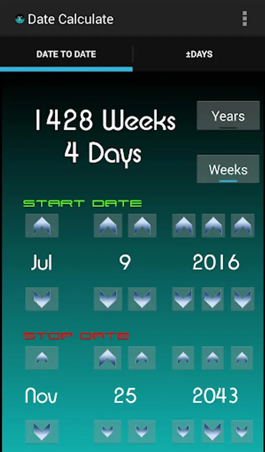 Date Calculate lets you quickly enter a start and stop date and the app calculates the number of days, weeks, or years in between!