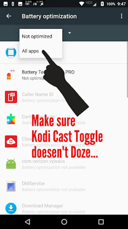 If the Toggle State toast messages aren't appearing when entering the Kodi app, please try taking KCT out of Battery Optimization Mode (screenshots in play store description - red text-). KCT will not adversely affect your battery life.