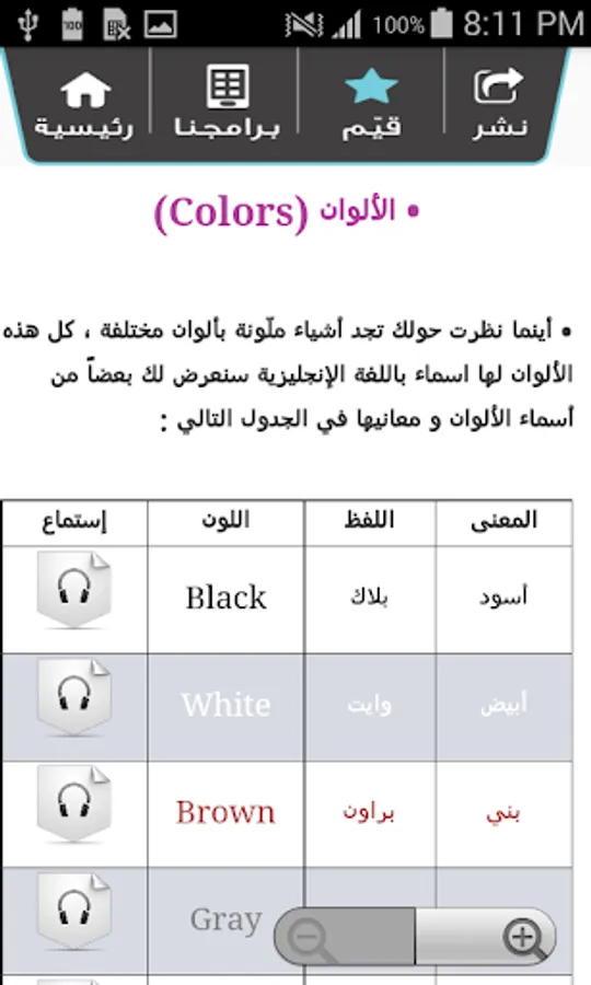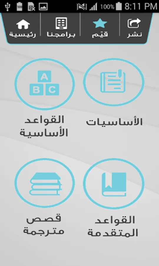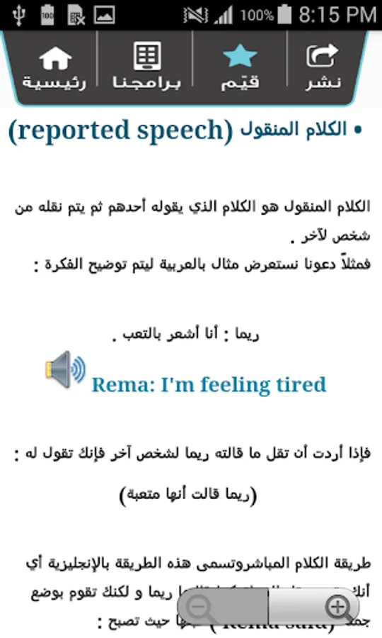 4. stories: includes a set of interesting stories with English translation so that you can get used to read the pieces English as an application of the previous stages