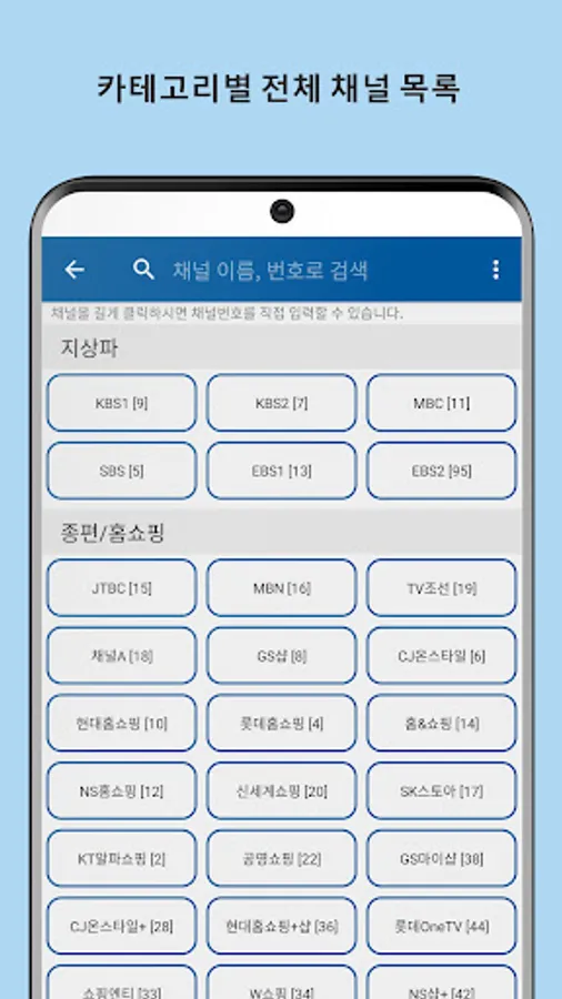 - Terrestrial: KBS1, KBS2, MBC, SBS, EBS1, EBS2 and local channels