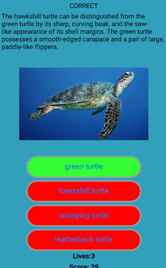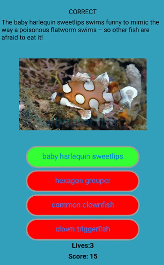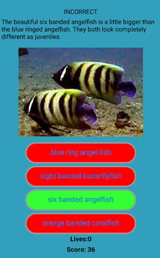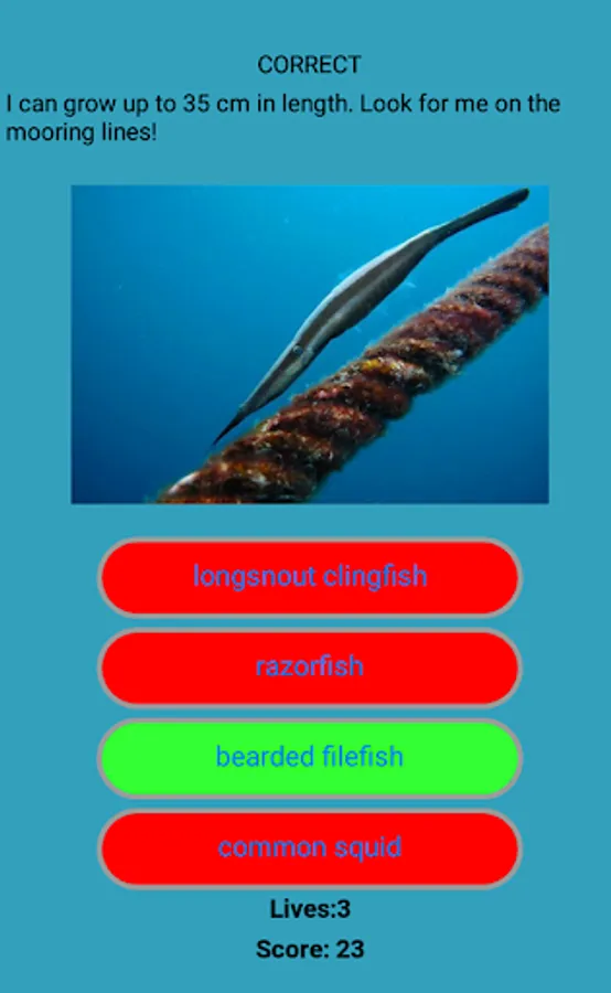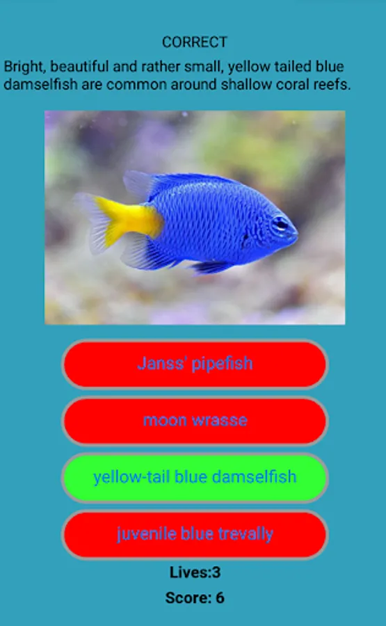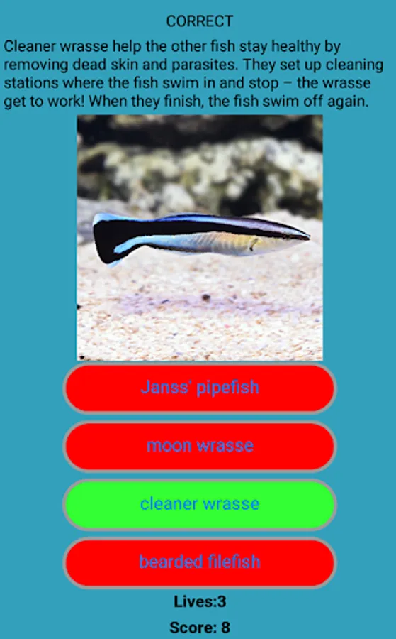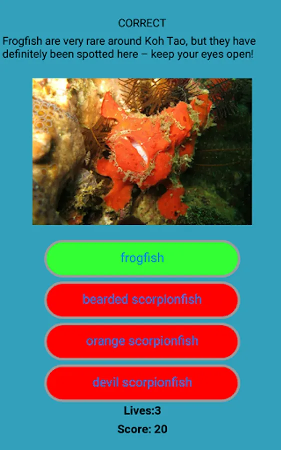 The "learning" section allows users to become familiar with the marine life and identify creatures without the use of the index. It will show you a picture of a marine creature and give you multiple choice answers - choose the correct name to move on. You only get 3 wrong attempts before the section resets. This is great for snorkeling and scuba enthusiasts - especially those doing professional dive training in Thailand. Enjoy becoming a walking fish-cyclopedia!