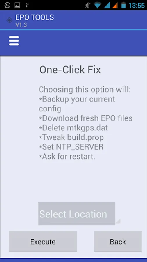 A backup of your original gps.conf and build.prop files are made with automatic restore.