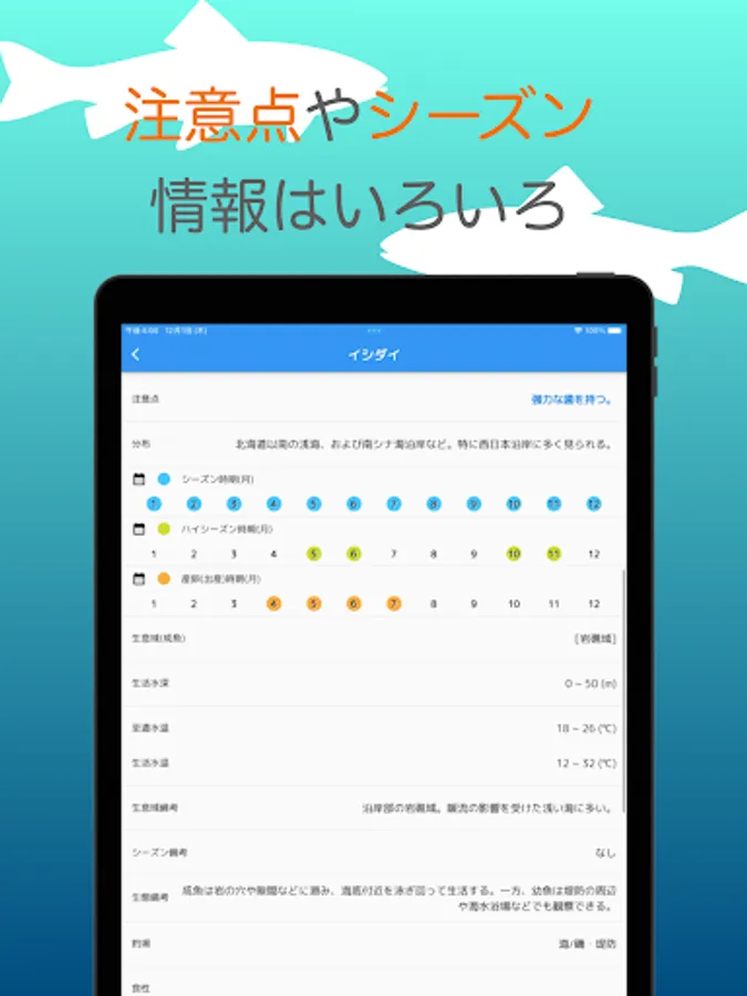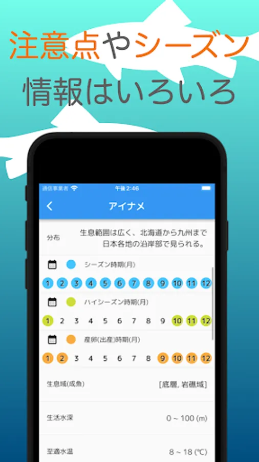 ●We have summarized information such as precautions for fish (whether they are poisonous, whether they need to be handled with care, etc.), season information, optimal water temperature, water depth, swimming layer (tana), spawning season, etc.